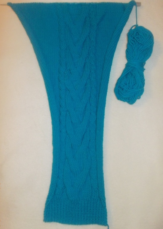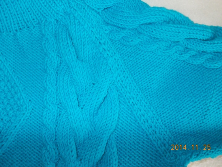 Рукав: набор 44п. итальянским набором петель 4р полой резинкой, 14р резинкой 1х1. В первом ряду основного полотна равномерно прибавить 6п. ( после корм. +1, в узоре №1+1, в узоре №2 +2, в узоре №1 +1, перед кром+1)=50п. Вяжем основное полотно кром+8изн+узор №1-4п+2изн+узор №2-20п+2изн+узор №1-4п+8изн+кром. Равномерно прибавляем в каждом 6р. Для скосов рукава по 1п. Очень удобно в каком ряду перехлест у узкой косы в таком и прибавка для скоса. В 120р закрываем с боков по 3п. и вяжем убавки реглана в каждом 2р. Таким образом: кром + 2лиц + убавка реглана + основное полотно + убавка реглана + 2лиц + кром. до 174р.