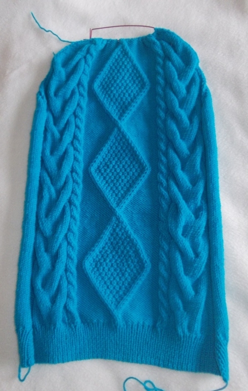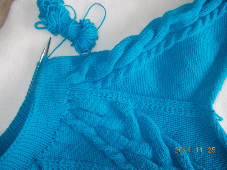 При этом для переда вывязываем вырез горловины. Для этого в 144р снимаем на вспомог. спицу средние 18п. и далее в последующих рядах снимаем 5п,4п,3п,2п соответственно.