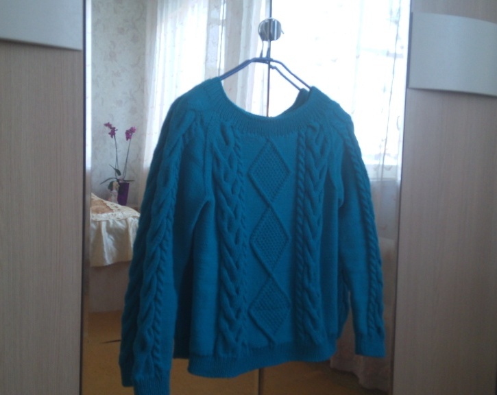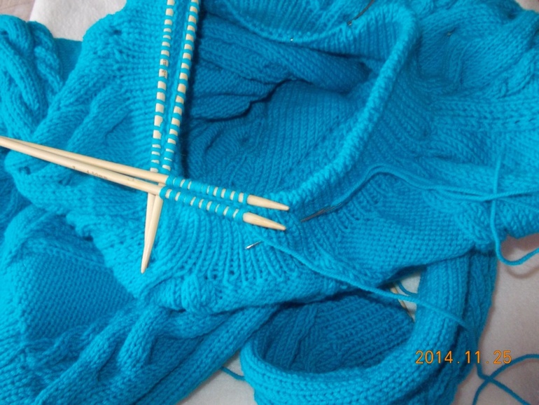 Горловина 176 п (по 60п. с передней и задней детали и по 28п. с рукавов).Ряжем по кругу 12р резинкой 1х1 далее полой резинкой 4р и закрываем все иголкой трикотажным швом.