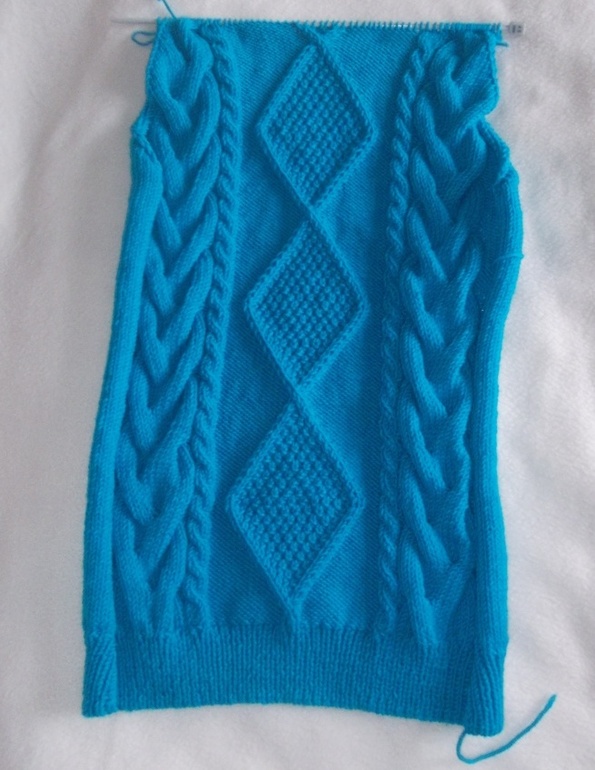 Основной узор №3:ромбы начинаем вязать из 4 петель как узкую косу прехлест в 3 р. потом в 5 ряду начинаем по узору смещать стороны ромба, при этом в середине вяжем жемчужным узором до 22п. Далее начинаем стороны убавлять до перехлеста.