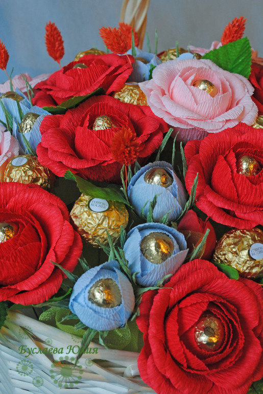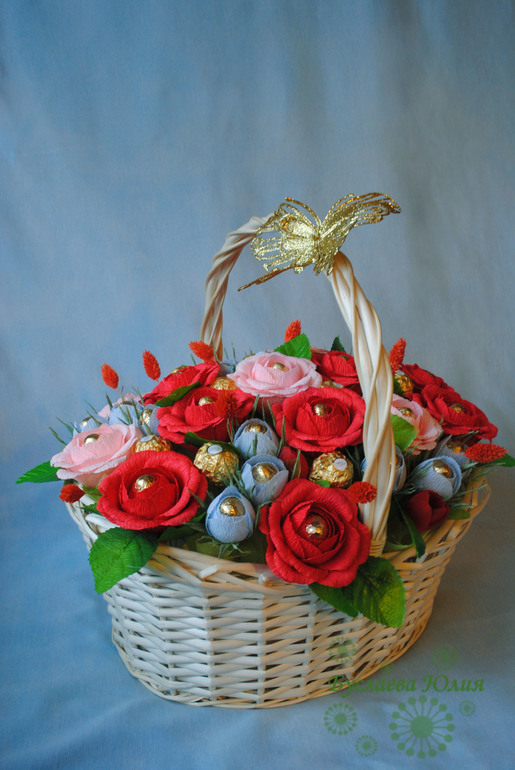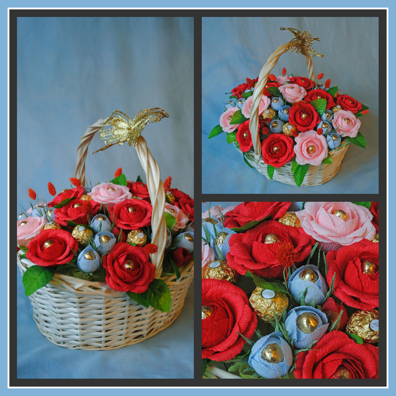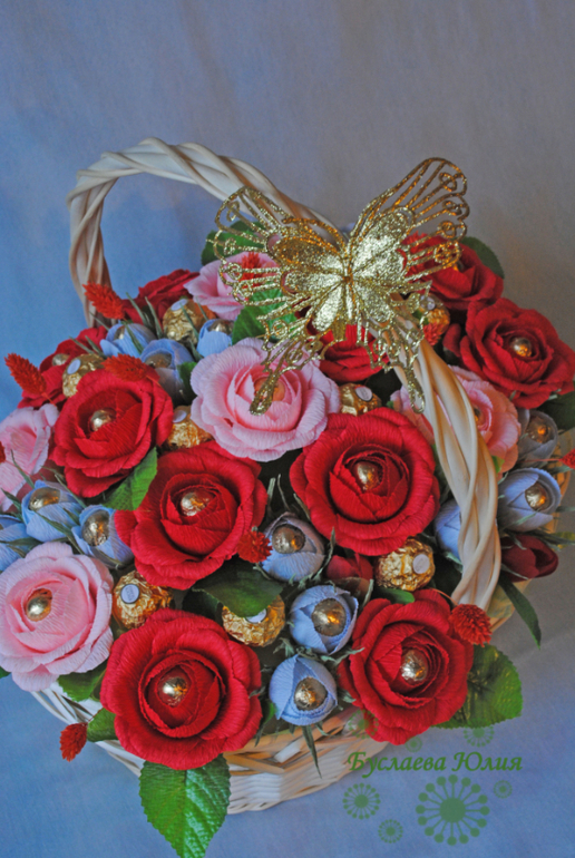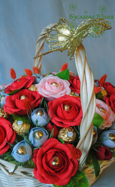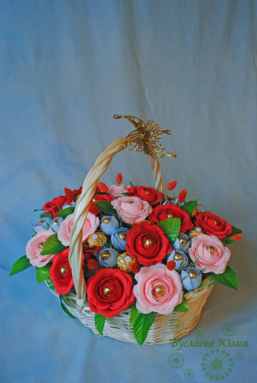 Сегодня покажу корзину, отдыхаю от новогодки. Клиентка попросила сделать корзину для 62-летней женщины. Пожелания: розы и цвета (красный, голубой, розовый), ну вот собственно и корзина. Прошу к просмотру.