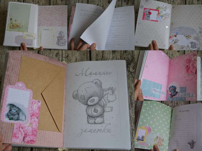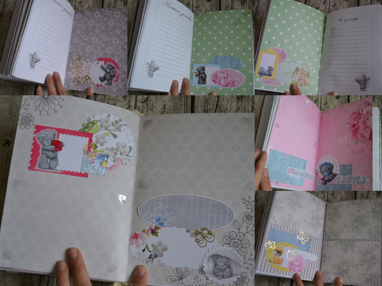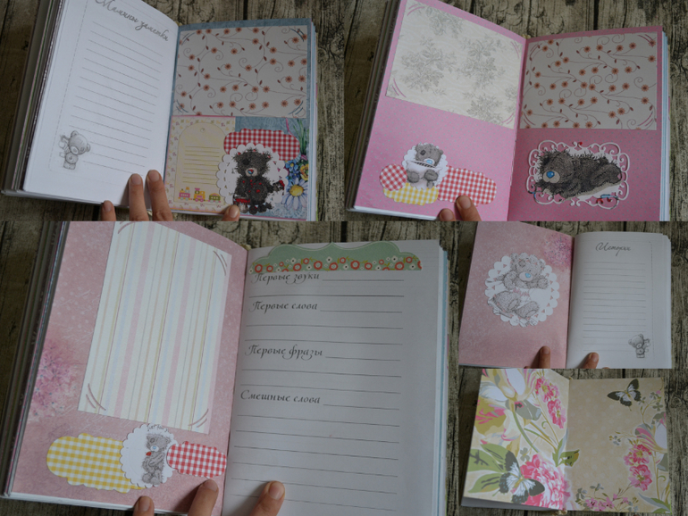 включает в себя даже историю беременности+ вы можете добавить много фото пузика и узи!Так же странички развития ребенка странички по месяцам+место под фото ,Словарик и страницы для смешных историй,