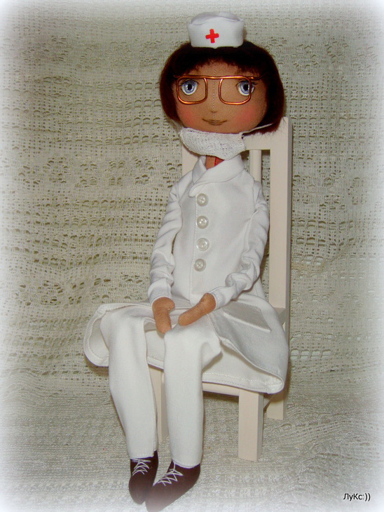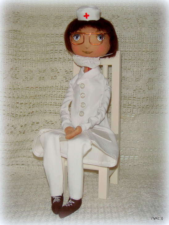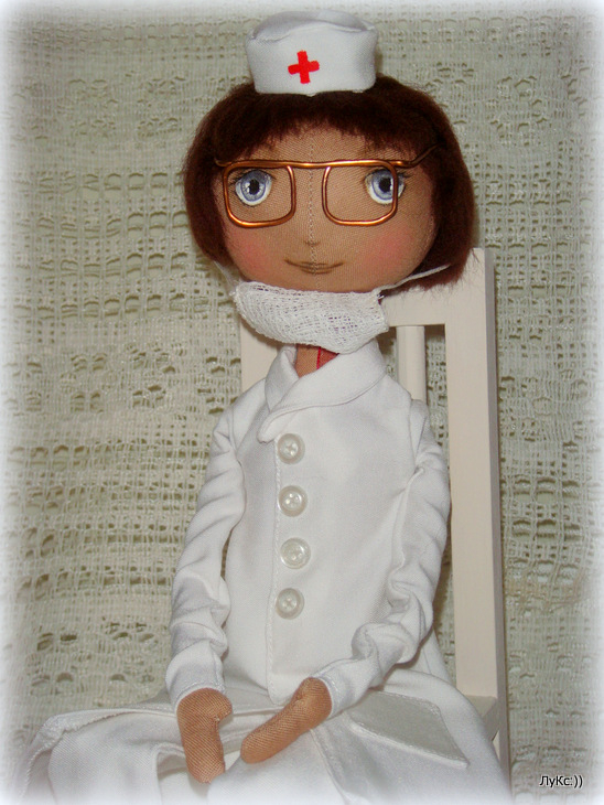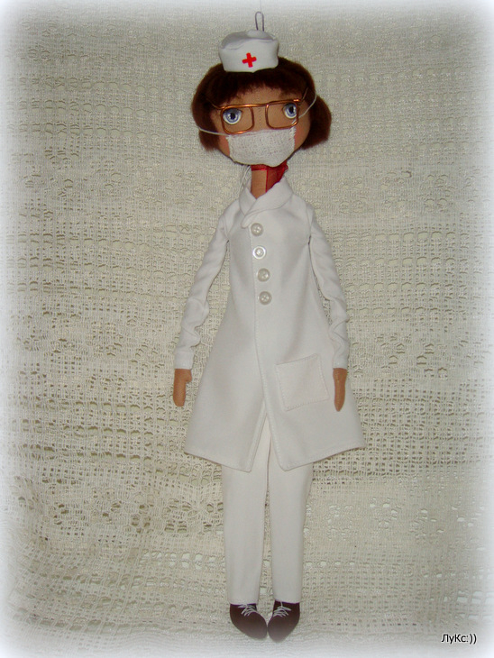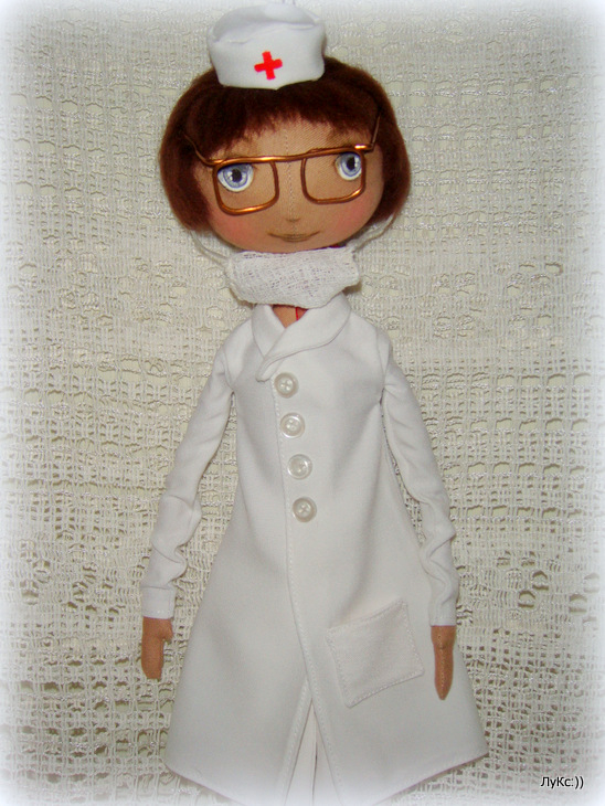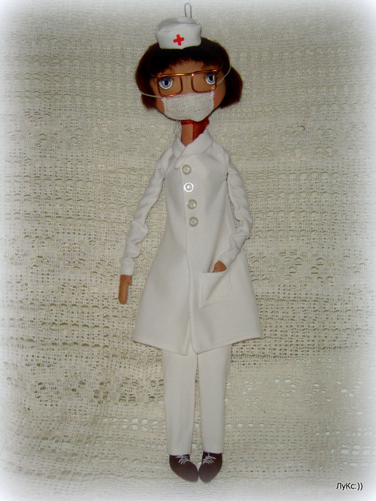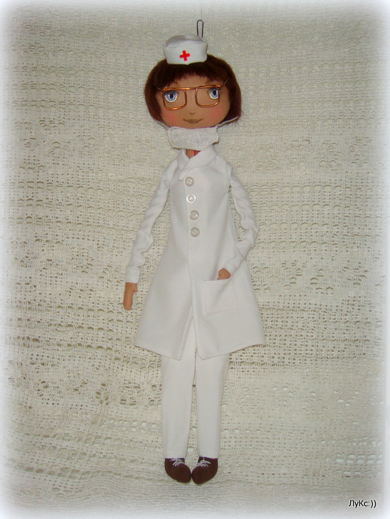 Ксюша, отличный доктор! Образ замечательный. В последнее время так часто ходим по врачам, что задумалась о сотворении подобного образа. твоя куколка очень похожа на нашего доктора))