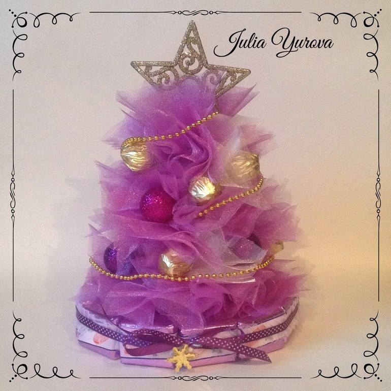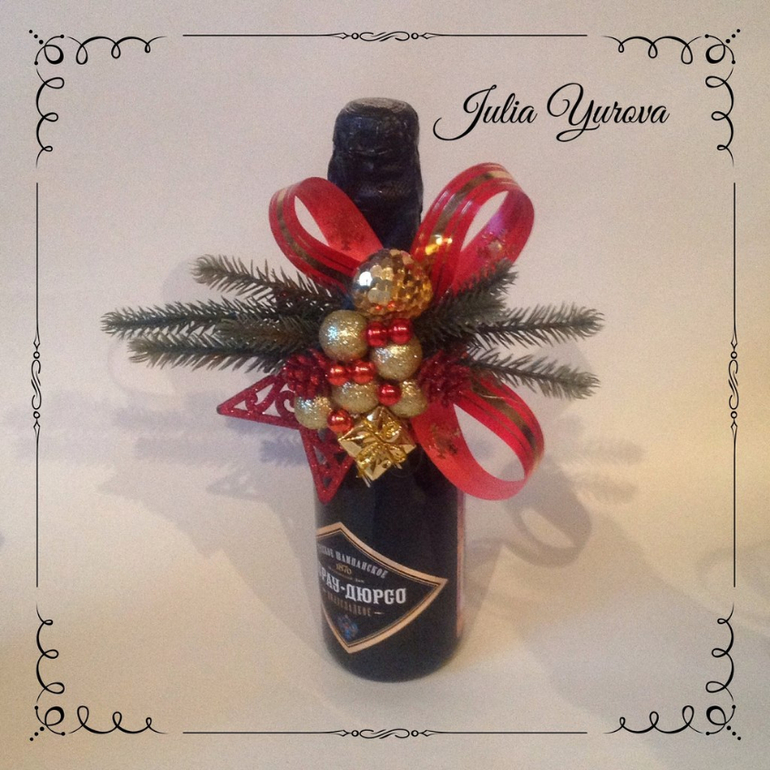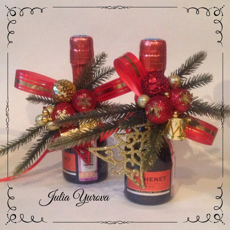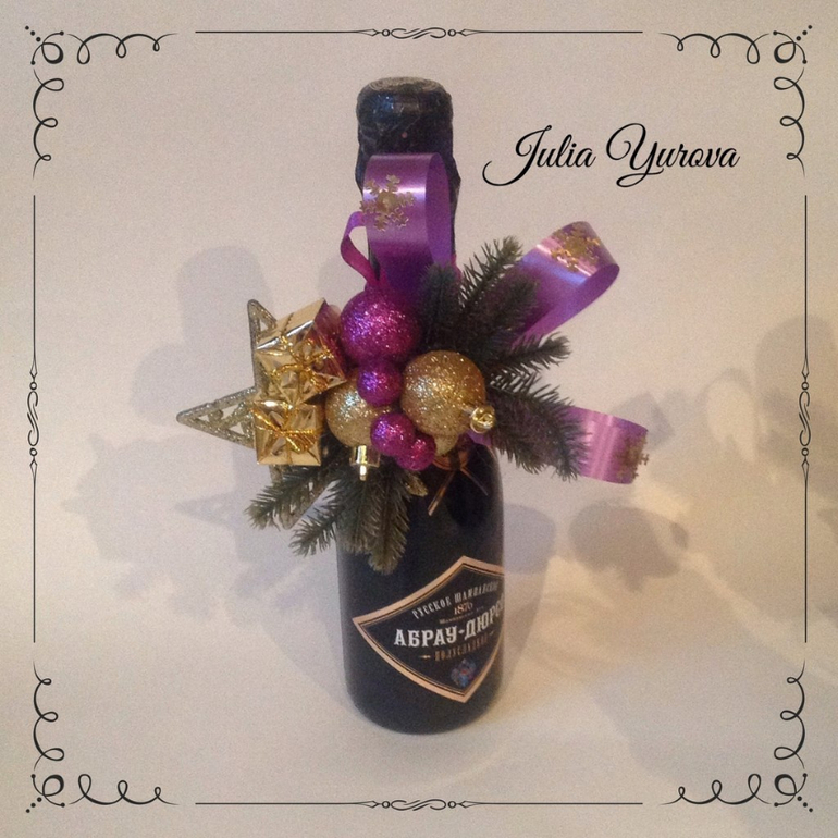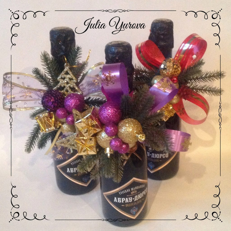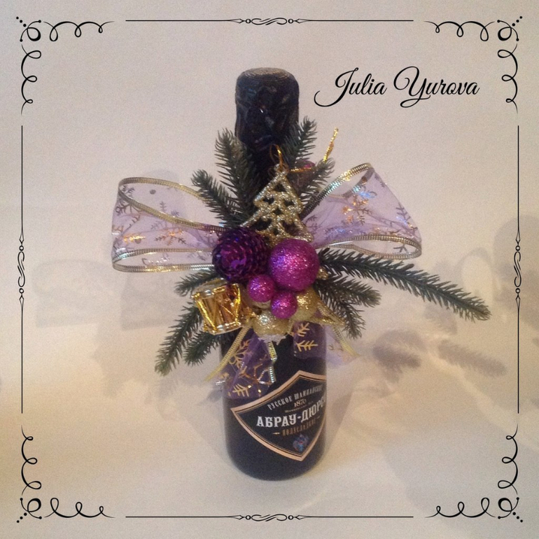 Юля, все прелестно. Елка мне очень понравилась (ну конечно, она же сиреневая!). Таких елок бы побольше в разном цвете - вот была бы радуга новогодняя! Украшалки на бутылках тоже очень и очень. Они без конфет?