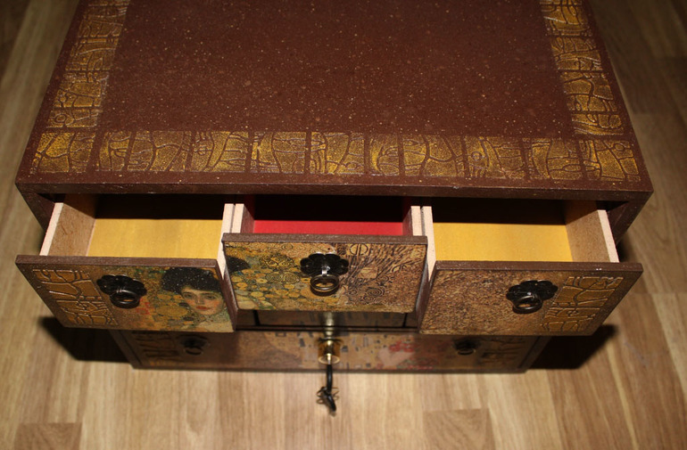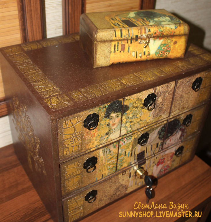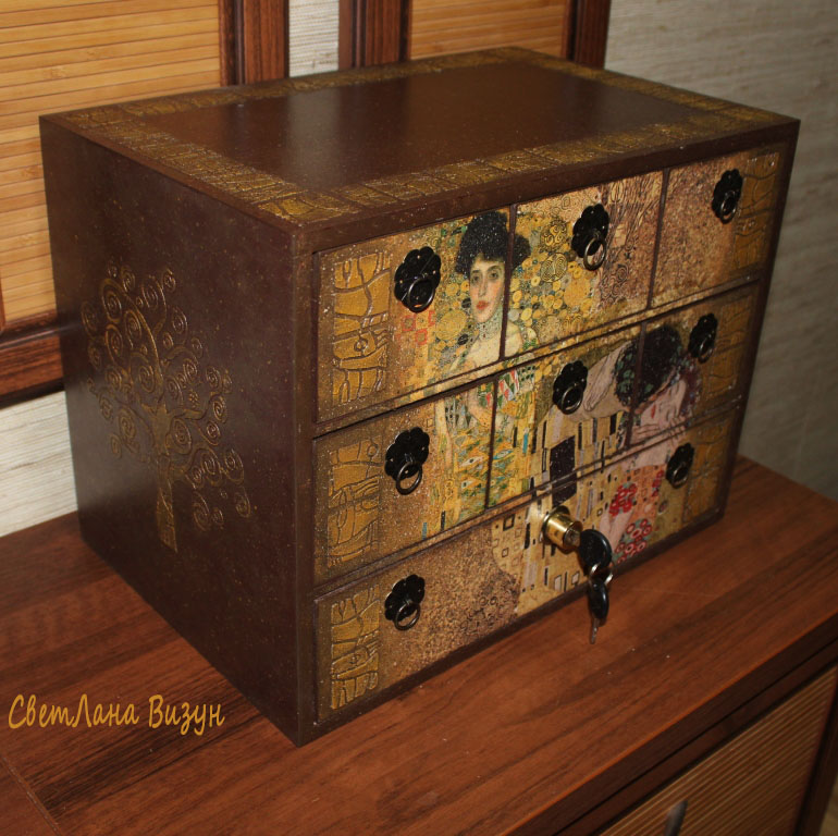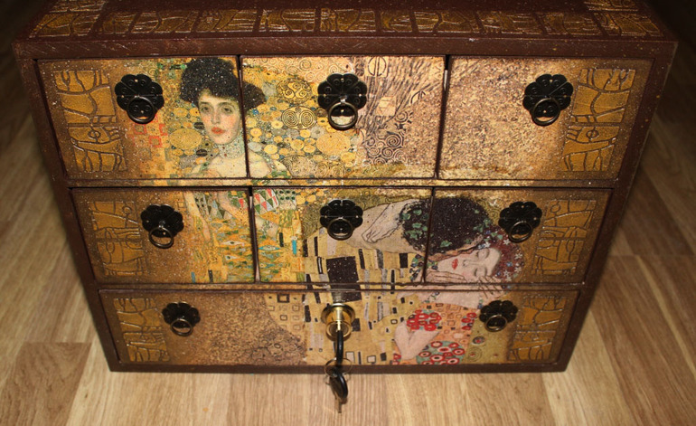 ДекупажЗаказали мне комодик по мотивам работ Густава Климта и я с удовольствием взялась! сверху ящички для украшений (на дно постелила бархатный картон), нижний большой ящик для аптечки (закрывается на ключ от дочки). Мне очень нравится! Так воодушевилась, что сделаю себе комод "Мой любимый Клод Моне" и "Мой любимый прованс" :)))