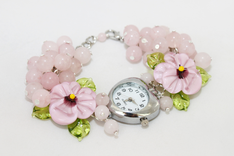 Часы "Анютины глазки" (розовые) Фурнитура под серебро, розовый кварц, авторский лэмпворк