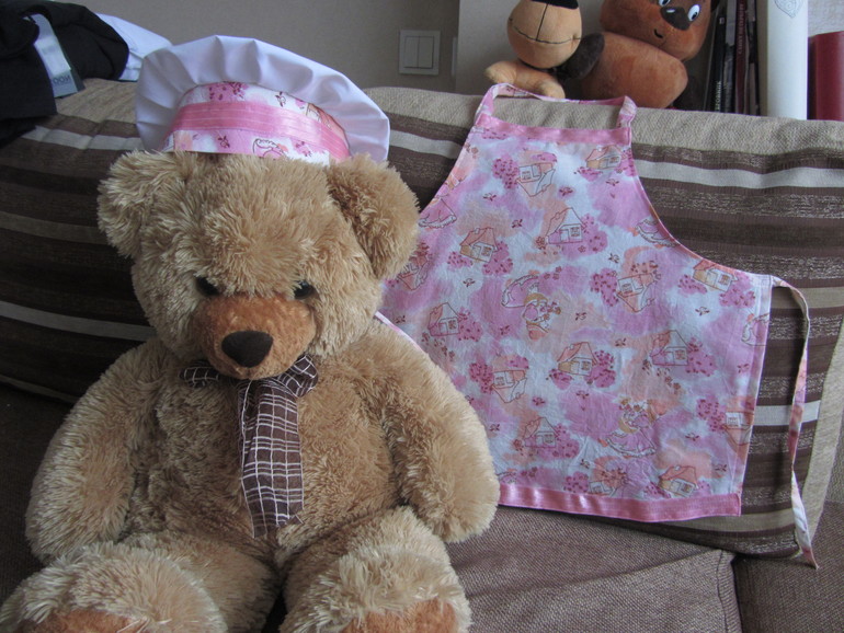 Быстренько всё это превратила в поварскую одежку и примерила на...медведя))))):