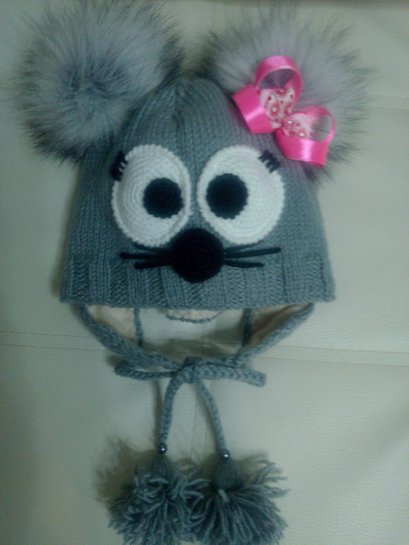 Долго я заглядывалась на подобные работы других мастериц и , наконец-то, созрела. Связала мышку в подарок, подарок пришелся по душе) А после того, как шапочку выгуляли, поступили новые заказики на мышат. Шапочка связана из полушерсти, подклад из флиса, мех искусственный.