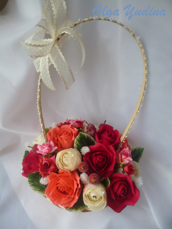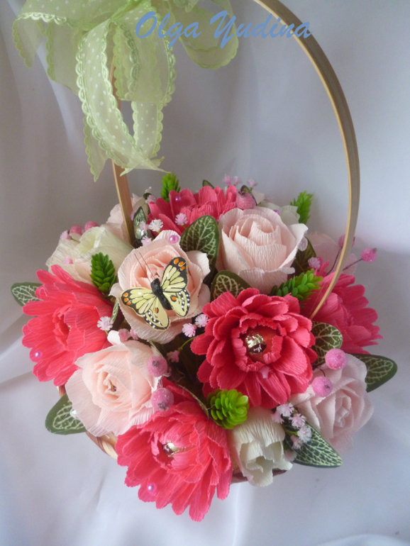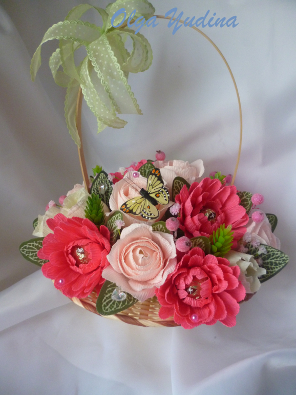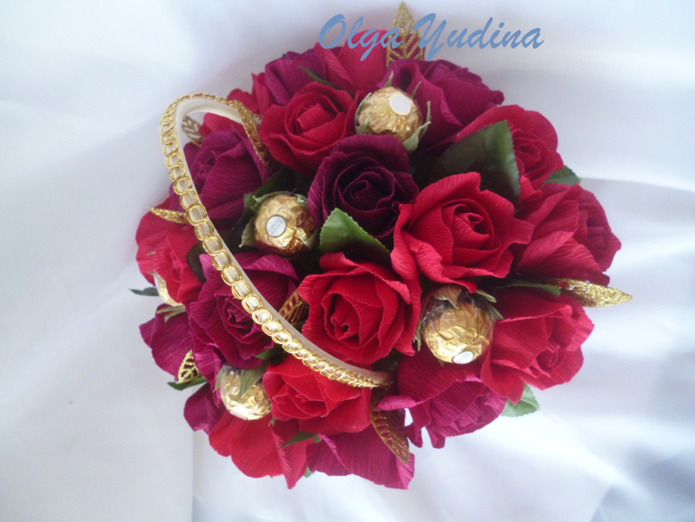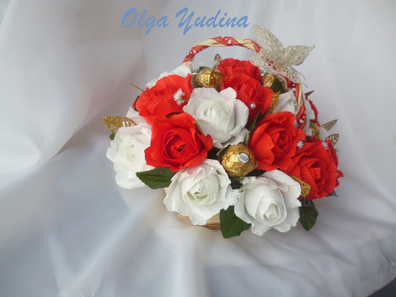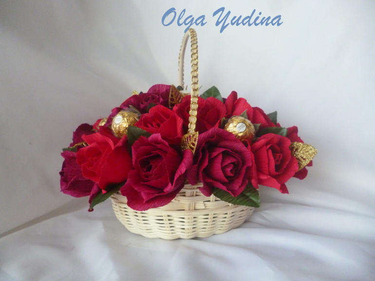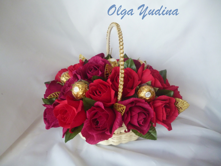Две корзинки. Для меня большой объем,я в среднем делаю 13-15 цветочков в букет или корзинку,а тут в одной 23,в другой 25 и по 5 феррерок.