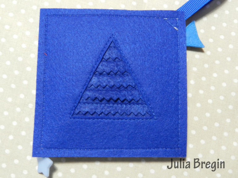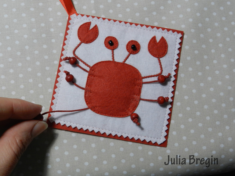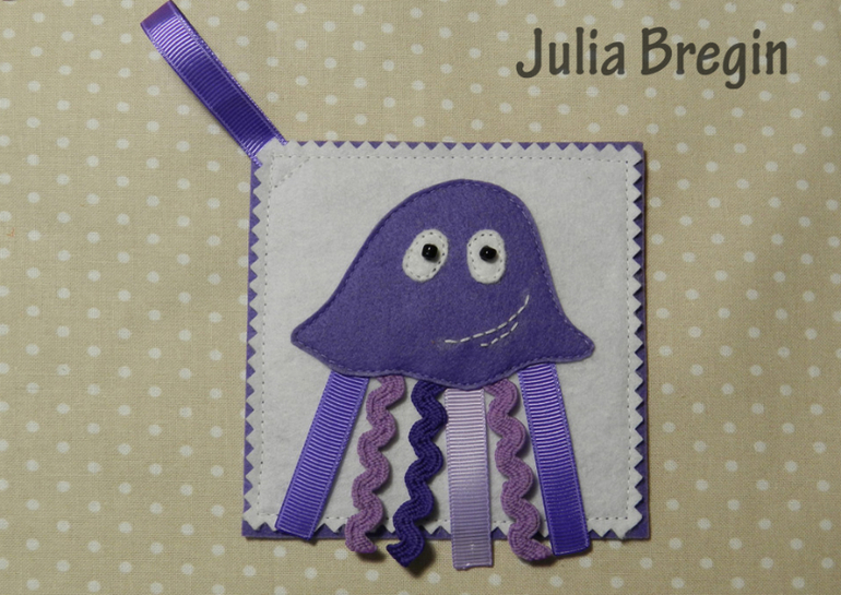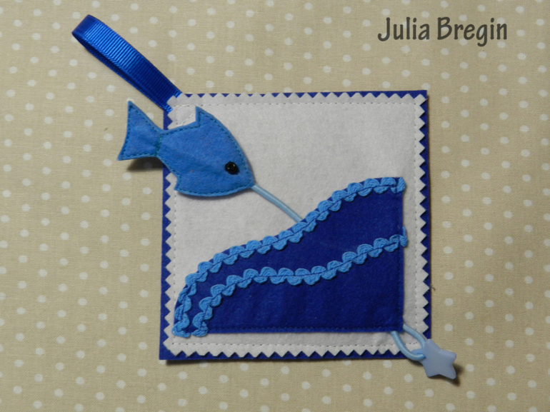 Теперь несколько деталей: лапки у краба двигаются, синюю рыбку можно тянуть, трогать ручками различные ленточки. На другой стороне фигуры - квадрат, круг, треугольник, ромб, овал, прямоугольник с различными фактурами для тактильныъ ощущений.