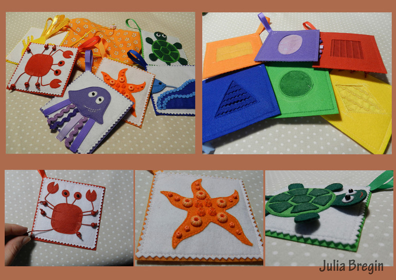 Карточки для изучения цветов. Мне заказали четыре карточки на морскую тематику для маленького мальчика. Не удержалась, сделала шесть: сине-желтый-зеленый-красный, добавила еще фиолетовый и оранжевый. В каждом изображении добавлены игровые моменты, с обратной стороны можно изучать различные формы и фактуры. Карточки 10х10 см, можно собирать за репсовую петелькуна колечко, цеплять к коляске.