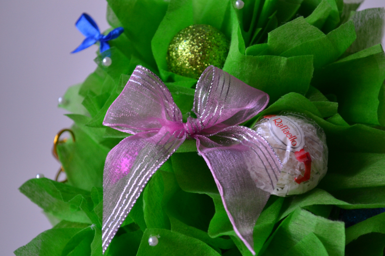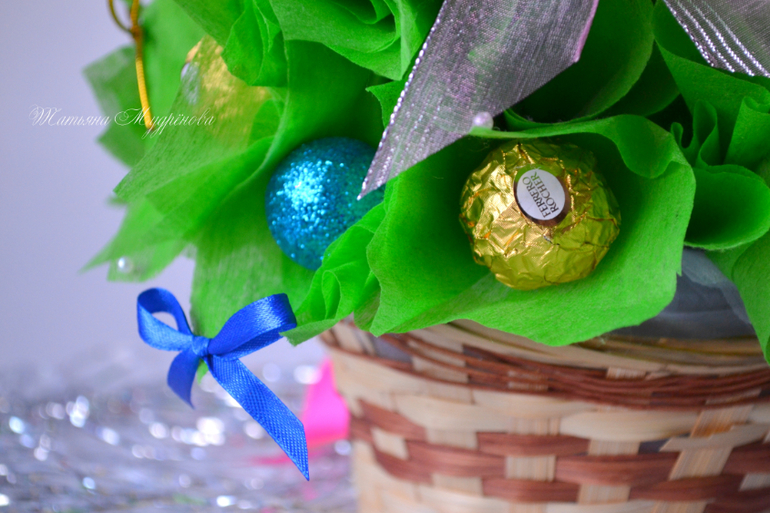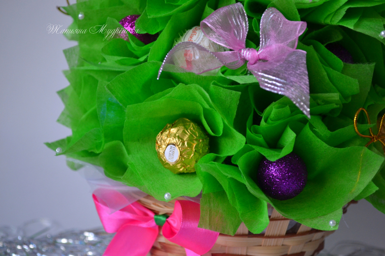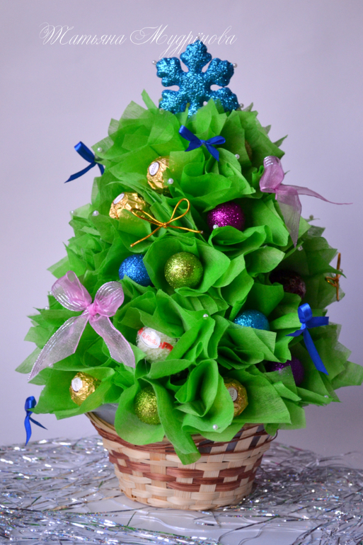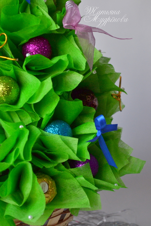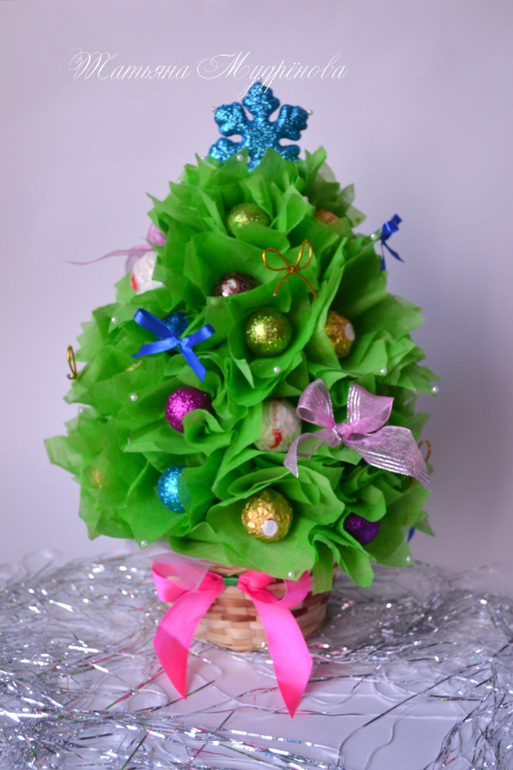 Главное не перепутать елочные игрушки сс конфетами )))В букете, мне не хватает какой-то воздушности, ну вот как обычно в твоих работах, а так хорошая елочка )