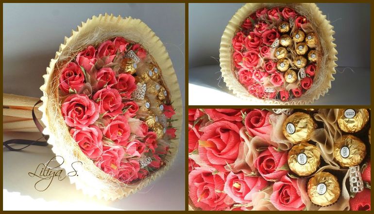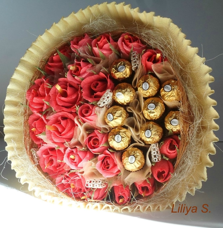 Оригинально! Гофра интересно обернута. Правда, по мне зелени не хватает, но без неё тоже хорошо!