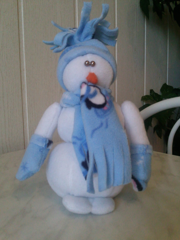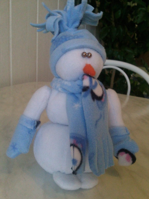 Поделки с детками.Сидим на больничном... Звонок из сада с просьбой об новогодней поделке. Решили с дочей сшить снеговика. Лизулька помогала ...усердно набивала тело снеговика синтепоном, а потом играла в снежки этими заготовками, выбирала флис для шарфа и шарфика. Пыталась резать флис. Наряжала - одевала снеговичка..
