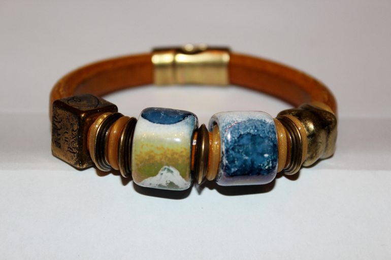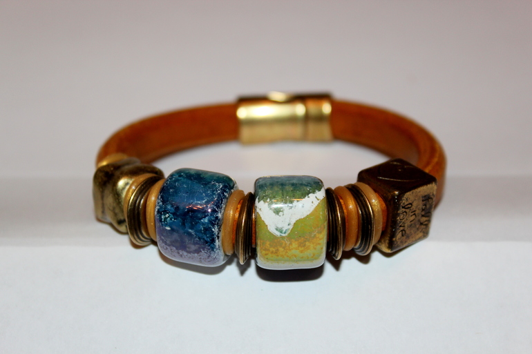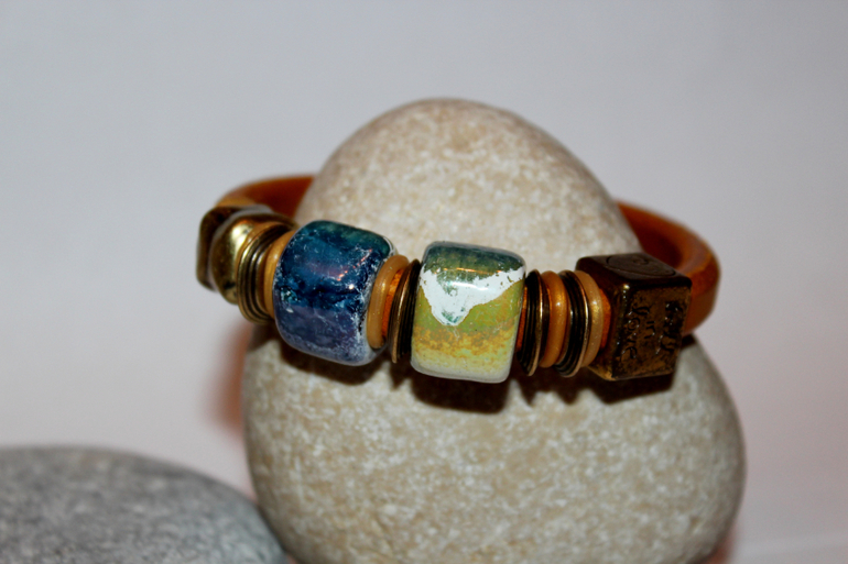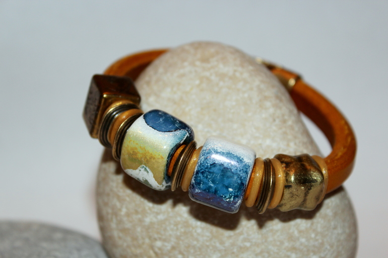 Шикарный браслет. Оригинальное сочетание необычных бусин и античной бронзы, на кожаном шнуре горчично-медового цвета.