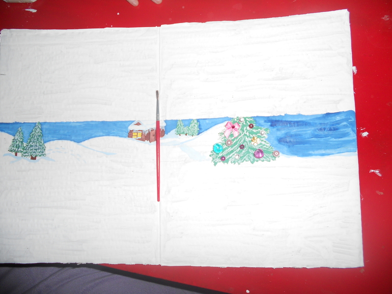 В интернете нашла разные новогодние картинки, распечатала. Ими обклеила баночки и карманы,нарисовала числа и все обклеила скотчем(для сохранности). Затем приклеила сначала кармашки, потом баночки,сначала на клей ПВА,потом еще для верности закрепила мебельным стэплером. И вот результат: