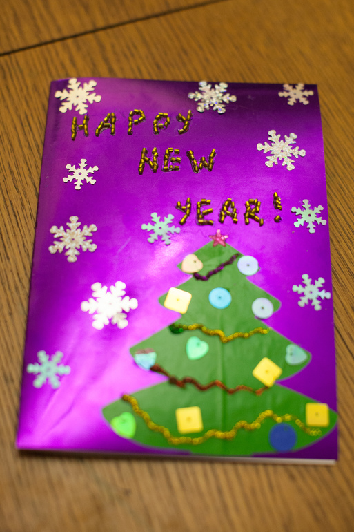 Открытку делали не очень сложную: из зеркального картона, бисера и пайеток, все красиво наклеили - ничего сложного!