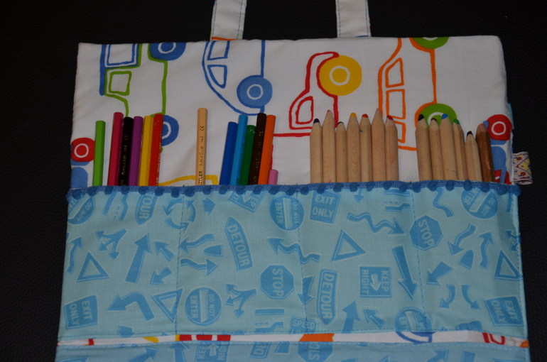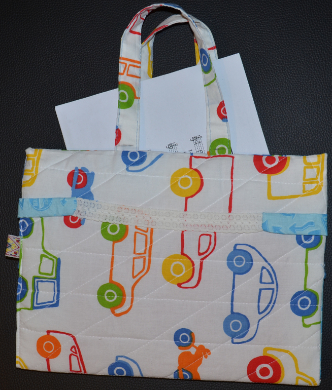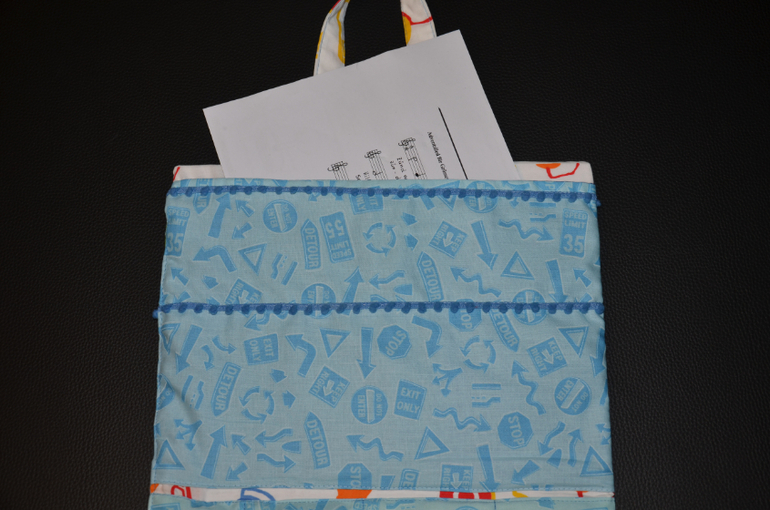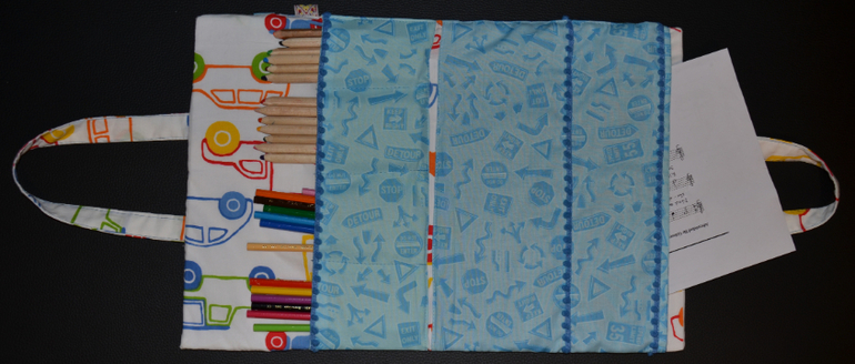 Это планшет в развернутом виде. Есть 4 кармашка для карандашей и большой отдел для листов А4. Мотивы для тканей не совсем музыкальные, т.к. я решила сделать планшет из того, что есть. Конечно, можно было в магазине купить ткать с музыкальным наклоном, но я решила, что потом можно и не для музыки планшет использовать. Можно, например, с собой его брать куда-нибудь для рисования. Да и машины и дорожные знаки как раз хорошо друг к другу подходят.