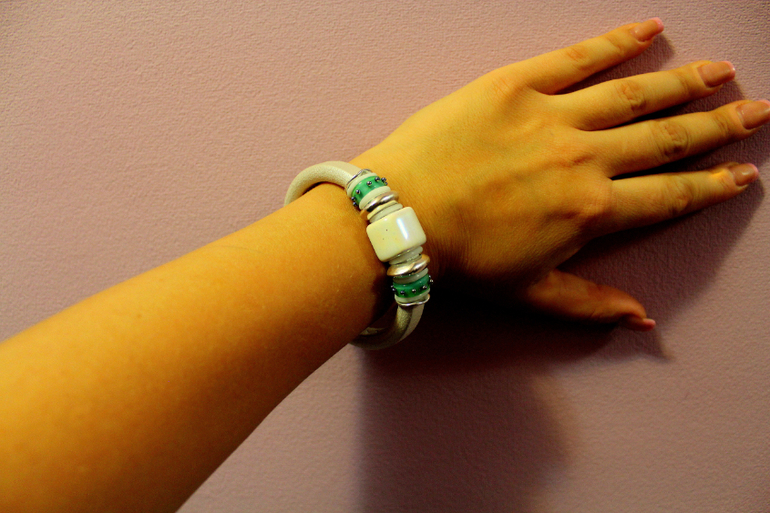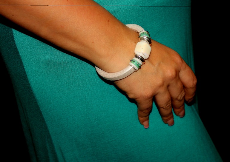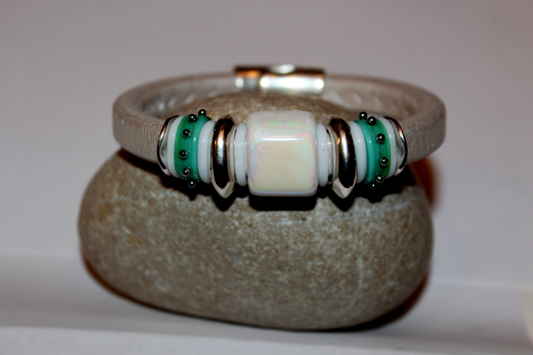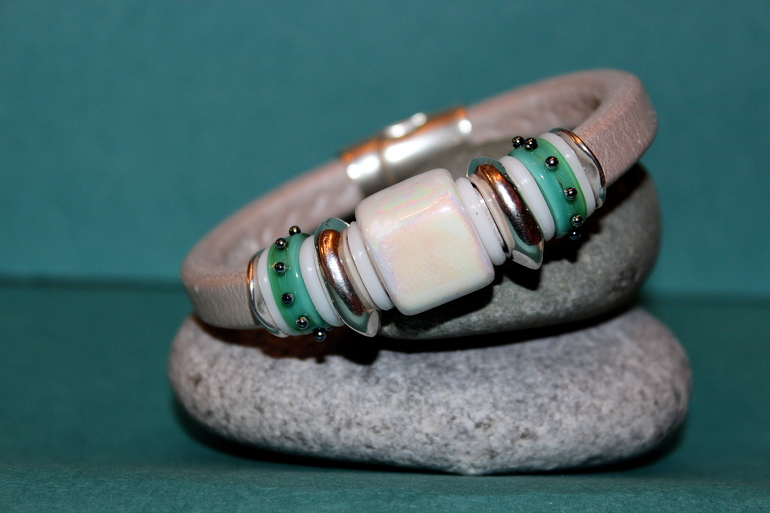 Бижутерия для слингомам. Слингобусы. Грызунки.Нежный и изящный браслетик. Молочно-перламутровая кожа, керамика, бусины лэмпворк ручной работы, серебристый металл.