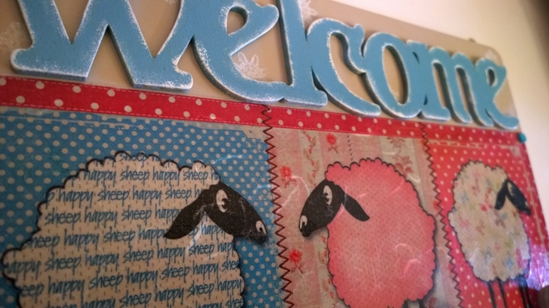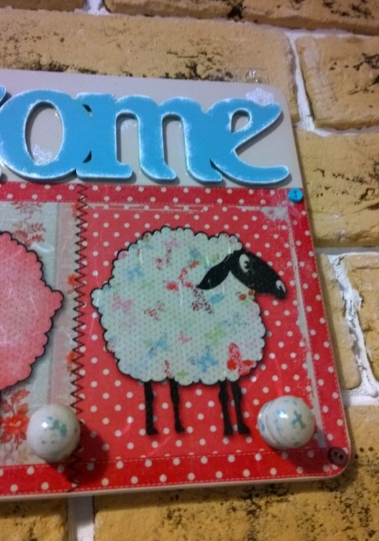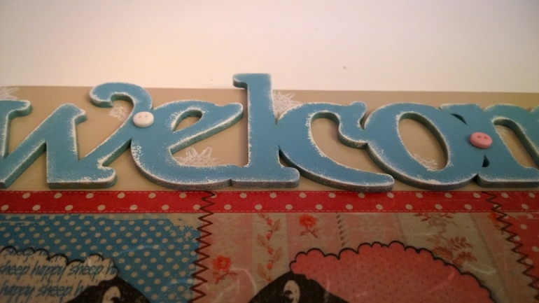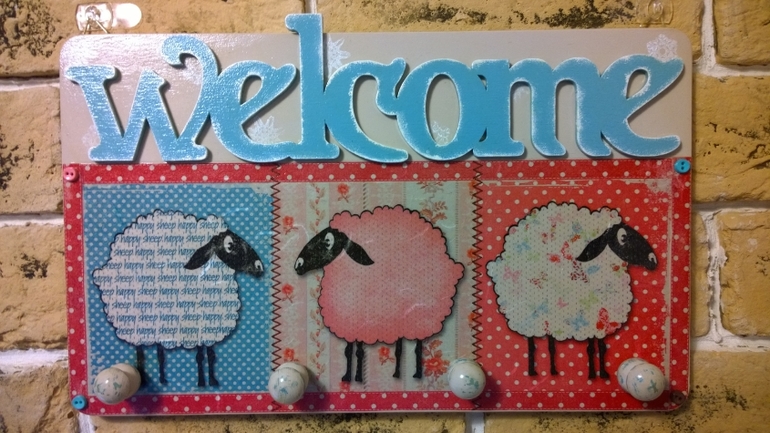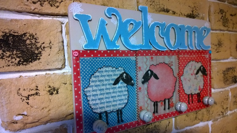 Размер готовой работы 30х20. Использовала мотив на рисовой бумаге с прожилками. Добавила фанерную объёмную надпись, приглашающую зайти в гости. Легкое состаривание, лакировка стойким к истеранию уретановым лаком, он желтит и это усиливает эффект винтажа.
