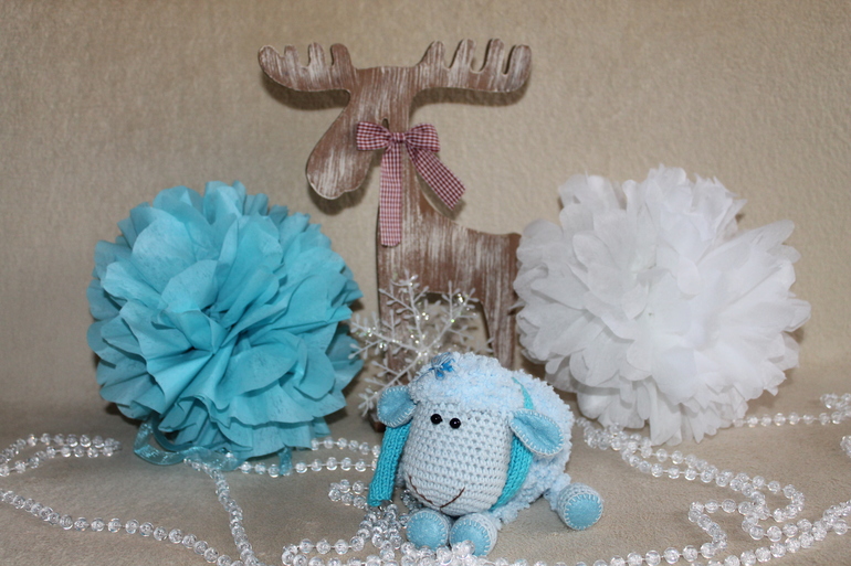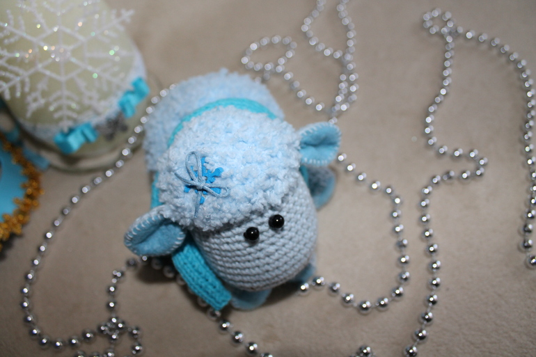 Снежинка родилась в конце ноября.Росточком около 15см.Связана из ниточки "Ализе анакузусу" и "Джинс",набита синтепончиком,копытца и ушки продублированы флисом.Кудряшки украшает пуговка-снежинка.