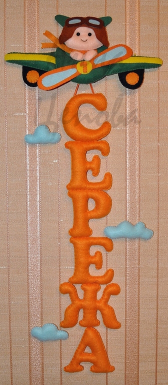 Дошила именную растяжку для Сережи, которому скоро исполнится годик. Сюжет и цвета определил интерьер комнаты, буквы высотой 8,5 см. Над фото не заморачивалась - как всегда, со вспышкой на неподходящей стене)