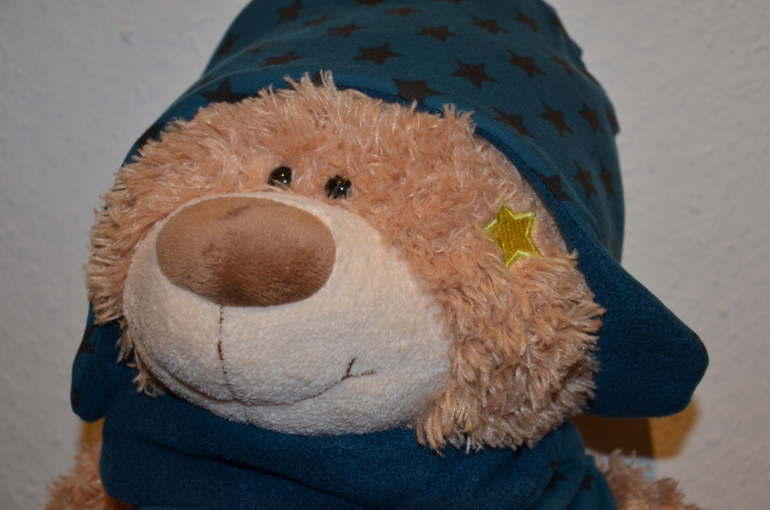 Шитье одежды, выкройки, ремонт одежды, шторы, швейные машины (уже приобретенные)И у нас похолодало... Поэтому достала все теплые шапки/шарфы/варежки - почти все зимние шапки оказались маленькими. Они, конечно, еще налезают, то сын жалуется, что давят. Поэтому решила сшить бегом, пока дите в садике, новенький наборчик на зиму. Начала шить еще днем. Вечером, уже когда дите пошло спать, дошила. Пришлось примерять на медведя.