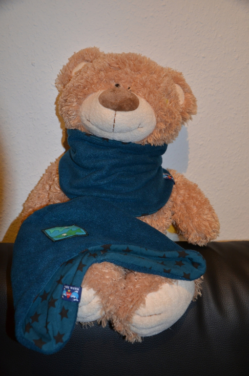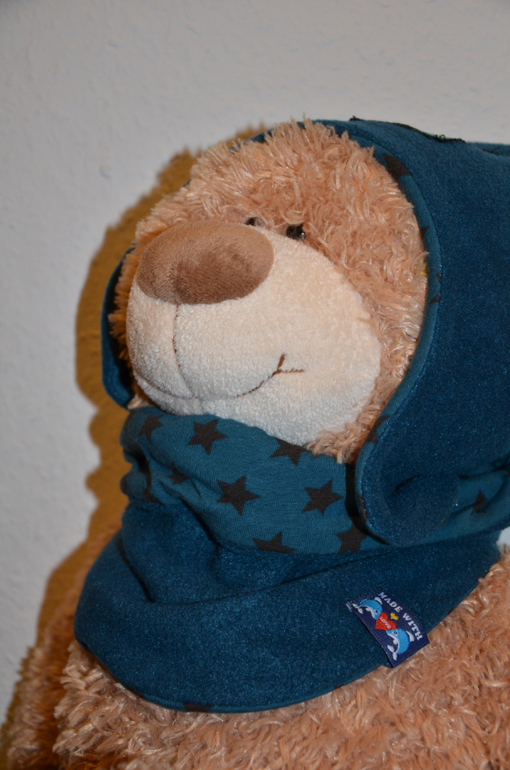 Набор двухсторонний. Одна сторона-теплый флис, другая-джерси со здездочками.Спереди у шарфа-хомута я удленнила переднюю часть, чтобы хорошо горлышко закрывало, т.к. ребенок не любит до конца куртки застегивать. Шапка как раз для зимы-уши и шею сзади хорошо прикрывает