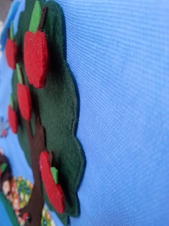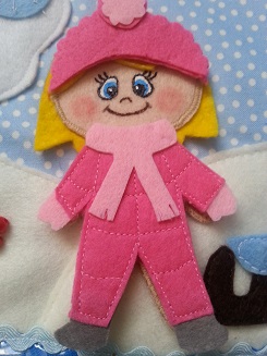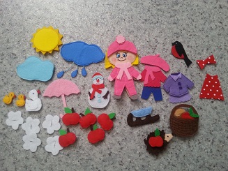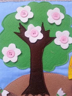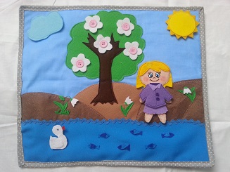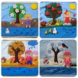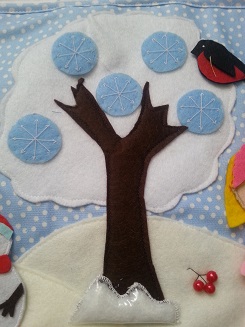 Мой самый большое (пока) проект на конкурс в детский сад - панно времена года. Основа идеи взята в инете, что то дополнено и придумано самой, все элементы лично собственоручно сначала нарисованы и потом перенесены на ткань и фетр. В работе использованы различные ткани, цветной фетр, флис, элементы декора). Думаю что по панно можно с детками изучать времена года, как и что происходит в каждое отдельно взятое время года: что весной все начинает цвести, прилетела уточка на речку, летом созрели плоды на дереве, у уточки вывелись утята, все вокруг цветет, летают бабочки, ежик бегает, осенью пожелтели и опадают листья, уточка с утятами улетела в теплые края на зимовку, начались осенние дожди, зимой это лед, санки, снеговичок, прилетел снегирь. Старалась одежку девочки сшить по временам года, надеюсь что похоже))) Много элементов сьемных на липучках, все съемные элементы двухсторонние с липучкой)). Шить и придумывать было одно удовольствие )