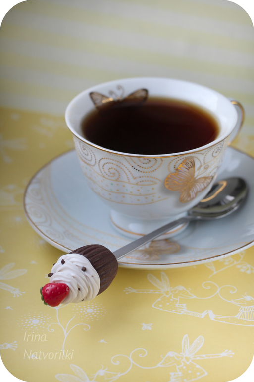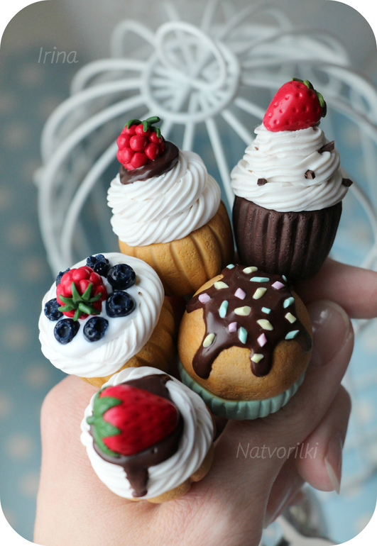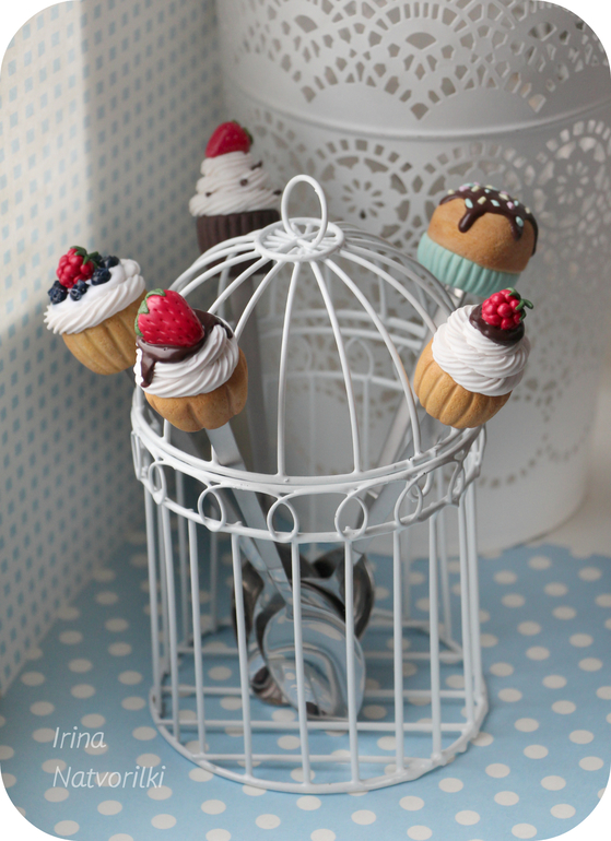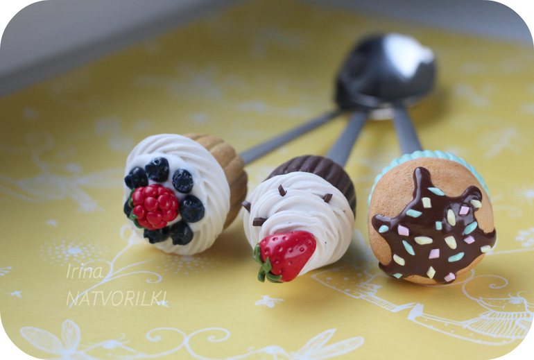 Ирина,а подскажите,я вот все засматриваюсь и тоже попробовать сделать хочу такое)какой материал нужно купить(может марку глины подскажете), вот на пирожных как глазурь-это как материал называется и в какой момент на ложки надеваете эту красоту и как они держатся? заранее спасибо)