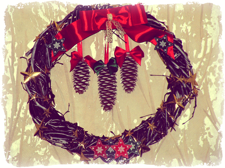 Как же сложно делать композиции из того что есть под рукой))) У меня вышел вот такой скромный веночек для нашего семейного Нового года.