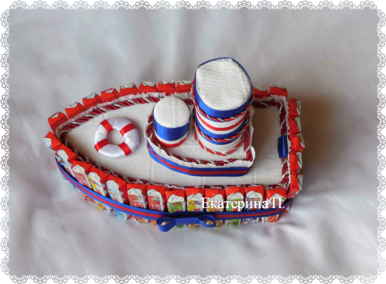 Девочки, выкладываю на ваш суд кораблик. Делала в подарок для сына подруги. Сначала хотела сделать торт с Киндерами, но потом решила, что кораблик будет интересней ))) с ним и поиграть потом можно ))) Результатом осталась не очень довольна. Во-первых, не нашла обычных киндер-шоколадок... только новогодние ((( Во-вторых, не люблю работать со шнурами. Вечно мучаюсь с краями ((( В-третьих, хотела сделать его как шкатулку, чтобы внутрь еще сладостей положить, но не успела ( из-за болезни бабушки ).