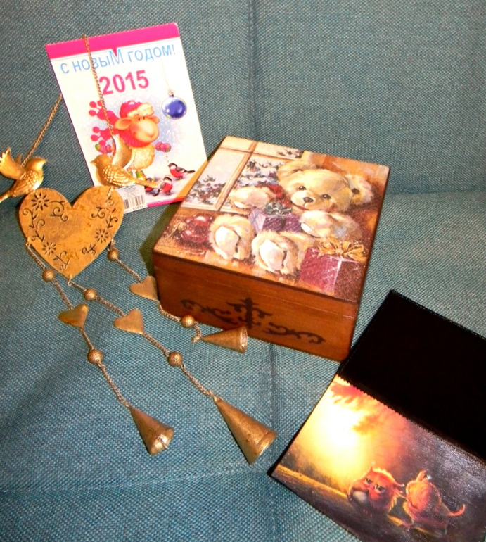 дальше..........я просто упала!!!!!!!!!!!!!! этот шикарный медведь!!!! шкатулка просто офигенная,от неё реально веет теплом,она прям плюшевая,а при открытиии слышны новогодние мелодии,пахнет елью,мандаринками и ароматным чаем...а ещё я обложечку у Янины выпросила,очень здоровская,мой паспорт уже переехал из другой Ясиной обложки в новую))