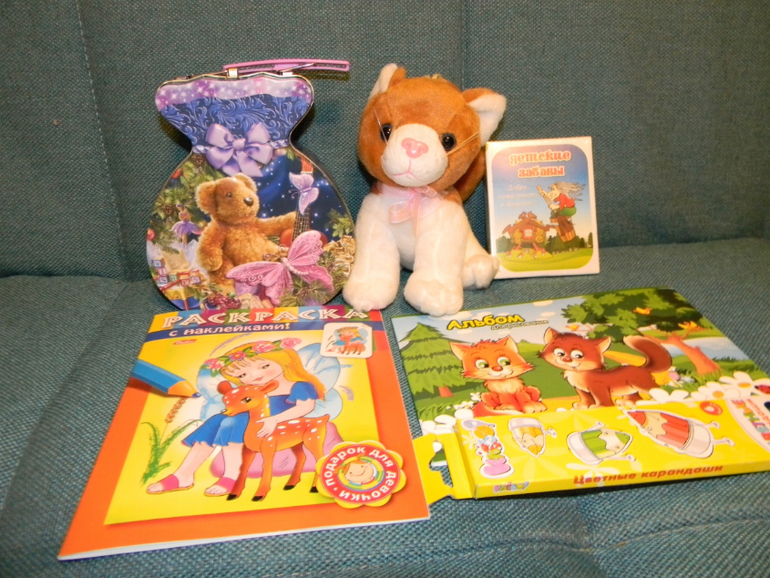 котёнку Соня очень обрадовалась,прям затискала всего его-и только под вечер мы обнаружили что он еще и мяукающий)) в коробочке девчачьи сокровища-любимые шоколадные барники,прикольные бусики с куколкой и море заколочек!