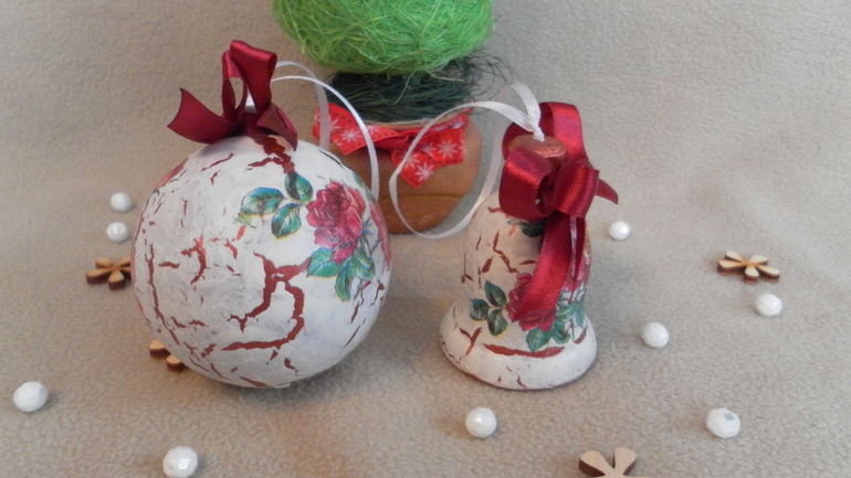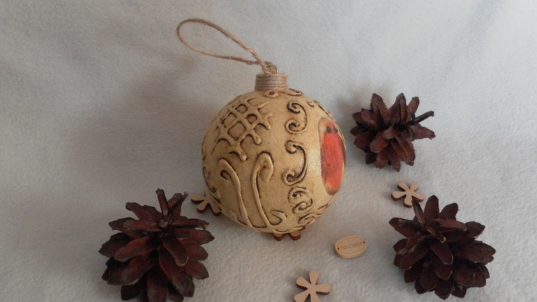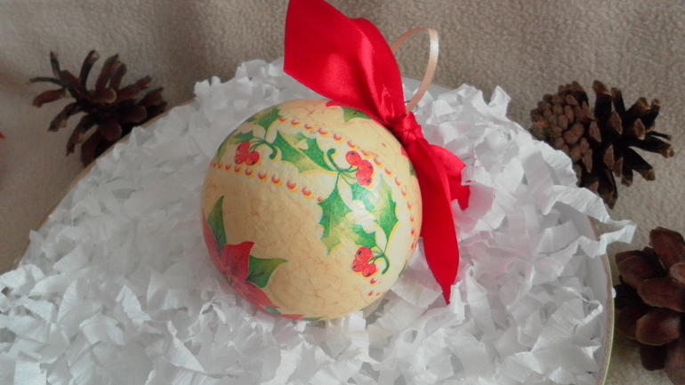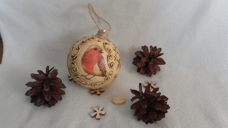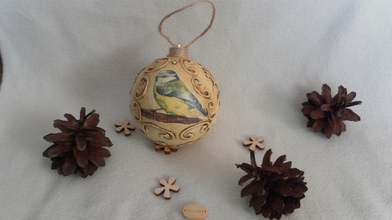 Шарик с птичкой. (по МК Янины Монаховой) (прямой декупаж, фактура при помощи шпаклевки+ПВА, битумный лак)