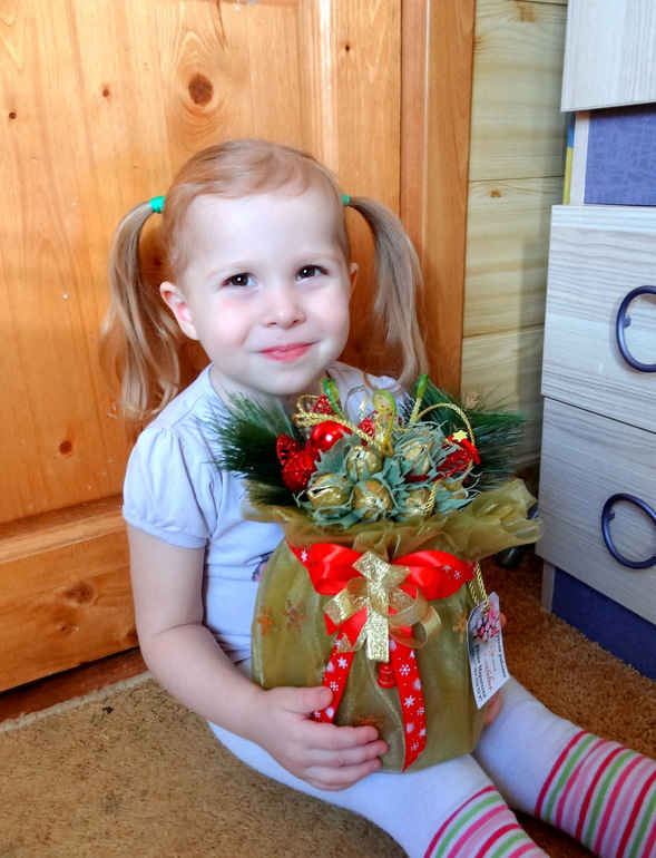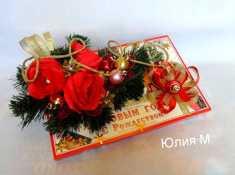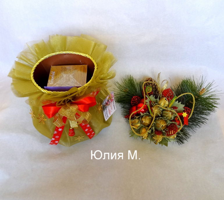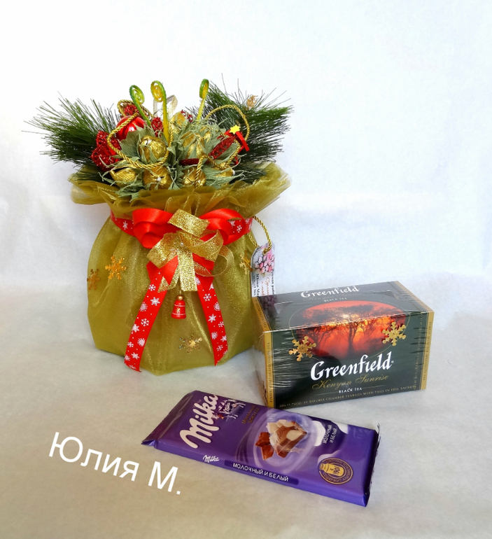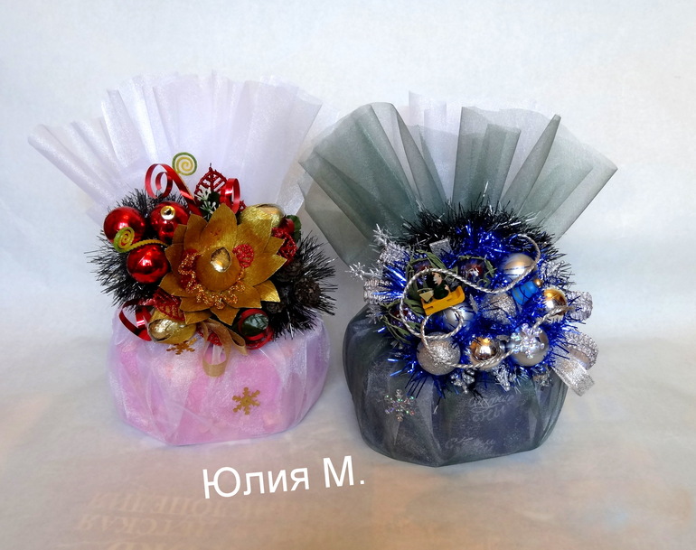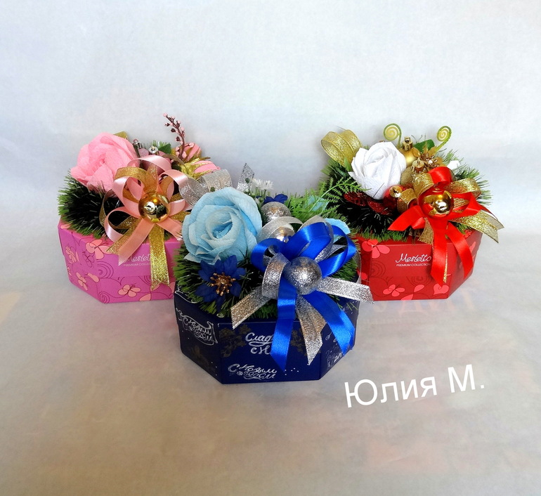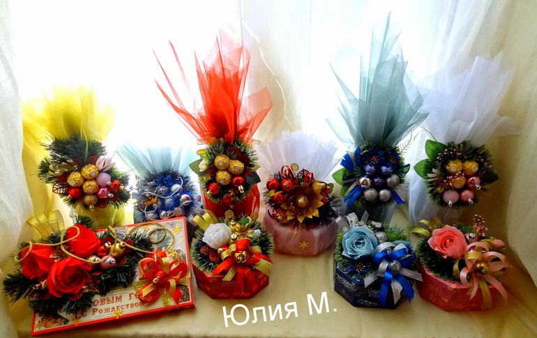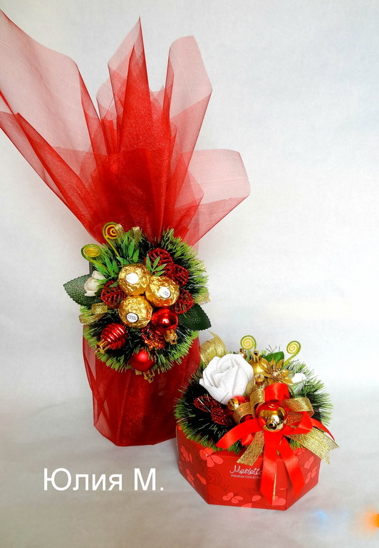 Юля. да я сейчас все больше по шампанскому в елочках)) К новому году у меня заказики на декор, а на букеты из конфет что-то к НГ спроса у меня нет))