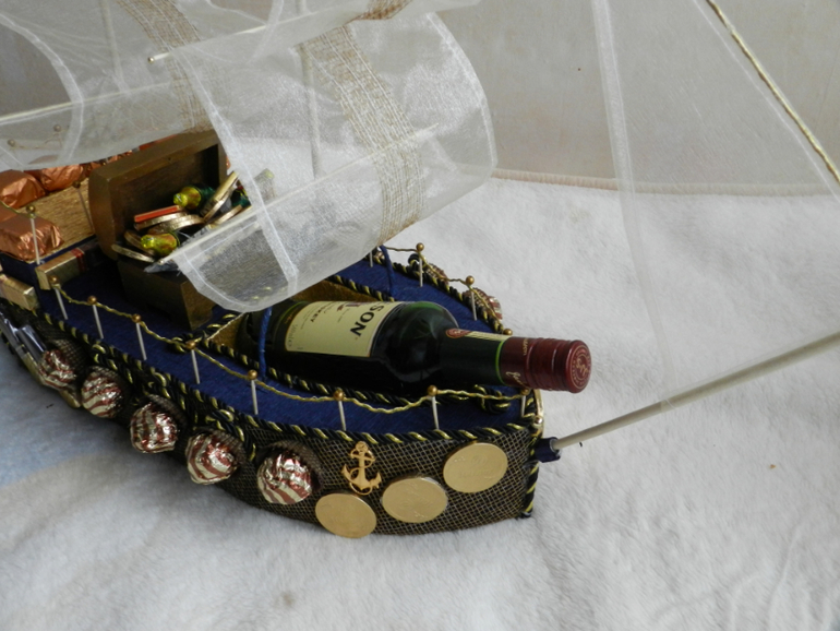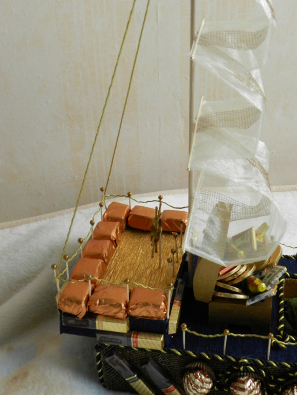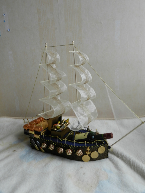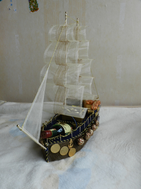 Девочки, всем доброго времени суток. Хочу показать Вам свой корабль (делала первый раз в жизни). История у него такова: был у дедушки день рождения, долго думала ,что подарить, и халат был, и подарочный сертификат тоже. И вот я лазила на просторах интернета и случайно наткнулась на такого плана корабль и решила сделать, нашла и мастер класс, и работа понеслась........ Вот результат. Есть небольшие косяки, но в целом работой я довольна. Дедушка и гости были в восторге