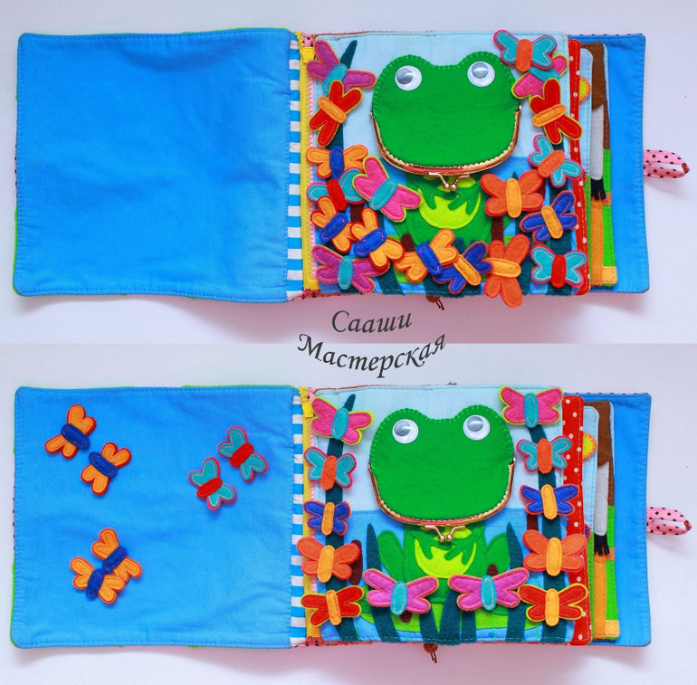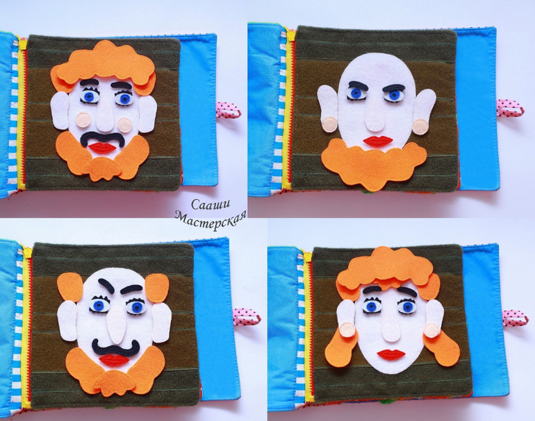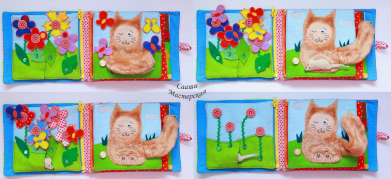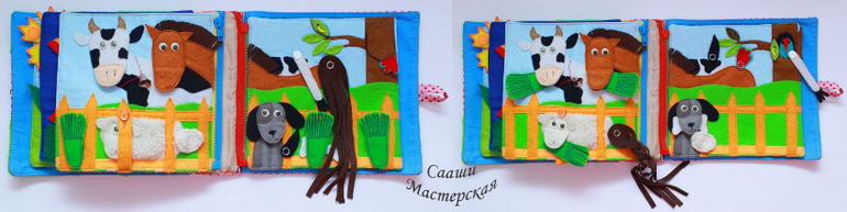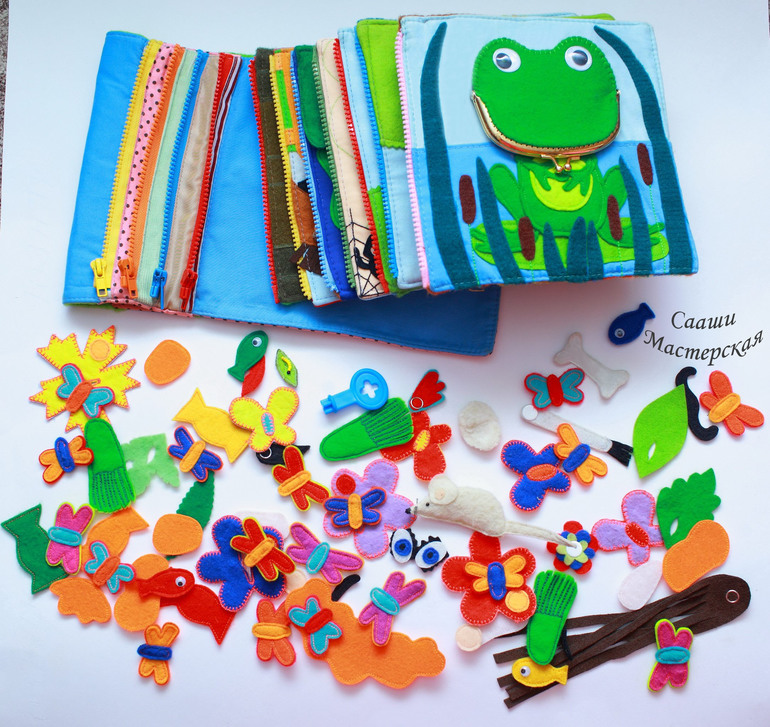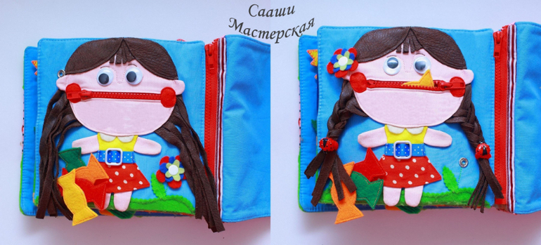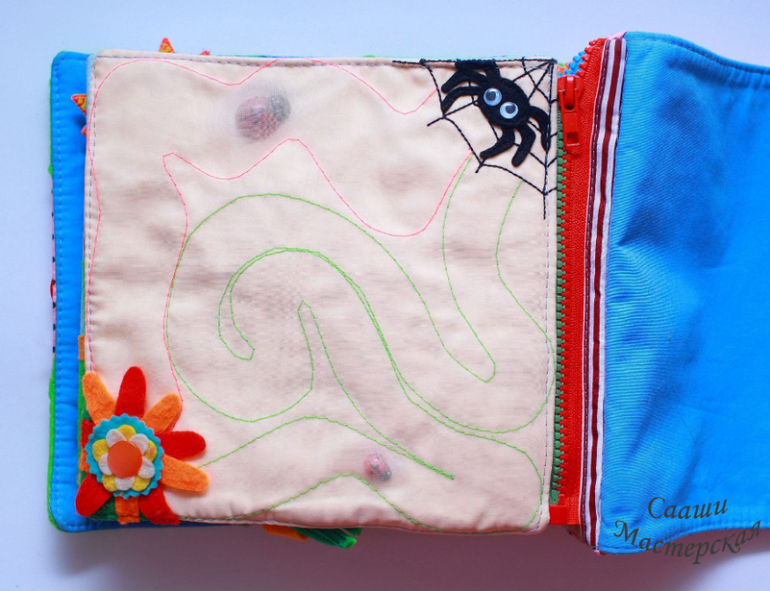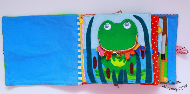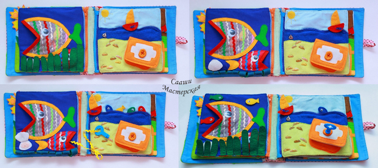 Каждую страничку этой книжки можно отстегнуть от обложки. Это удобно для игры и очень облегчает процесс ухода за книжкой, благодаря наличию молний её можно стирать частично. Помимо этого к такой книжке можно сшить сколько угодно страничек и менять их по мере необходимости.