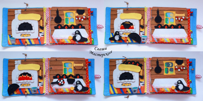 Каждую страничку этой книжки можно отстегнуть от обложки. Это удобно для игры и очень облегчает процесс ухода за книжкой. К тому же к такой книжке можно сшить сколько угодно страничек и менять их по мере необходимости.
