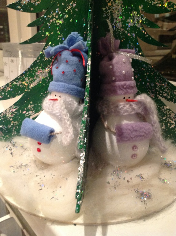Елочка (заготовку давно подарили в магазине) в детский садик и снеговики в подарок воспитателя.