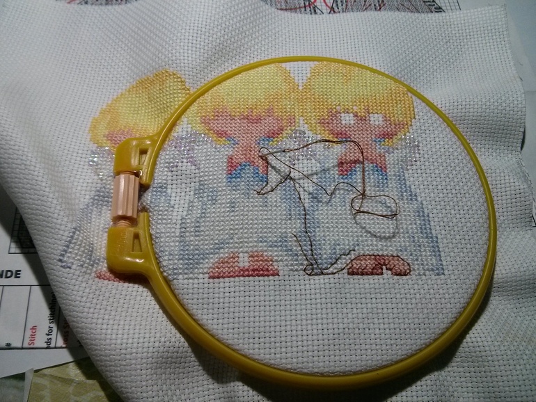 ой я тоже купила начала вышивку, вышила только личико среднего ангела и забеременела))) потом уже в роддоме на 40й недельке довышила)