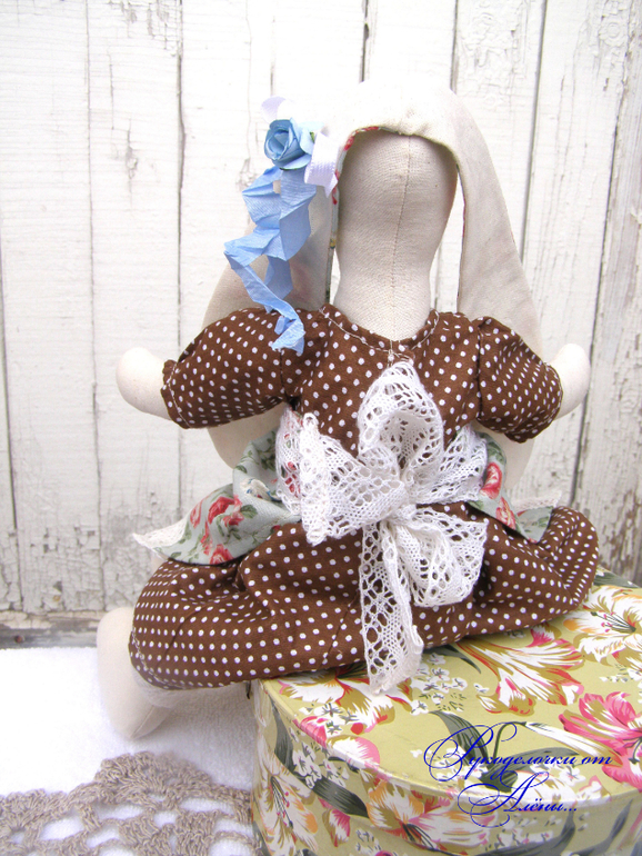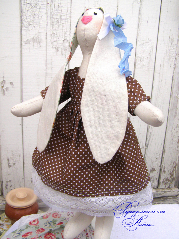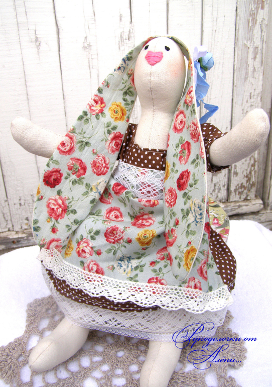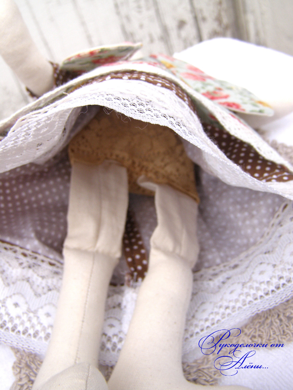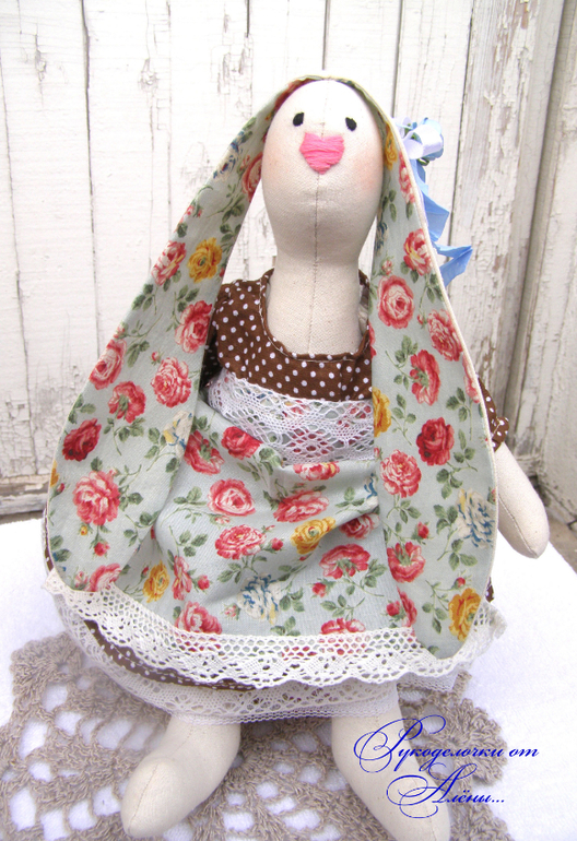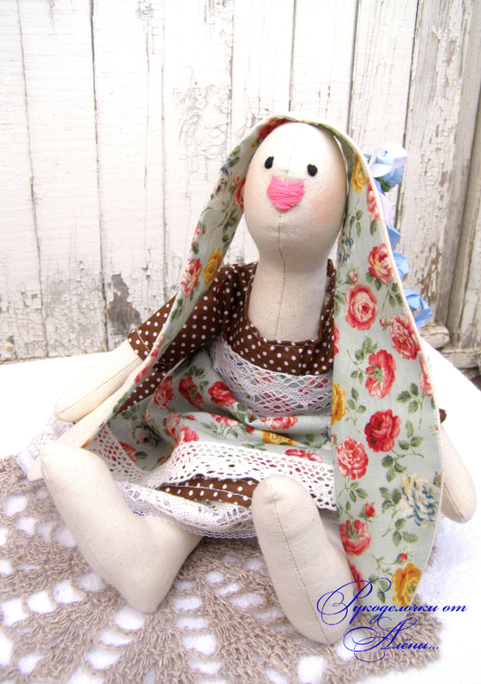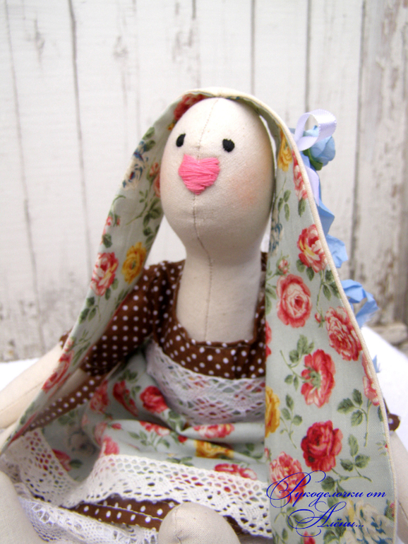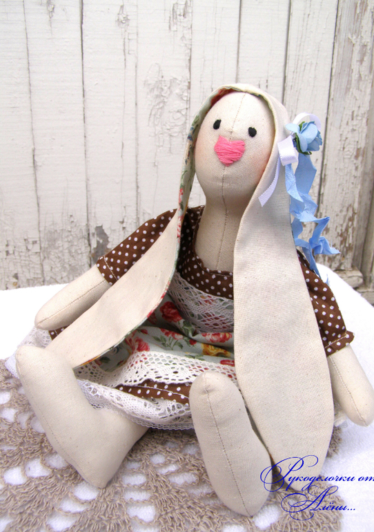Сшила повтор Зайки Евы...Вот ведь интересно. По той же выкройке..а заечка получилась совсем другая))). Милая,домашняя,нарядная девочка,самостоятельно сидит за счёт конструкции платья,вислоухая, забавная, обнимательная. Платьице снимается, фартучек съемный на кружевных завязках...Заечка получилась игровая). И у неё есть замечательная родительница).