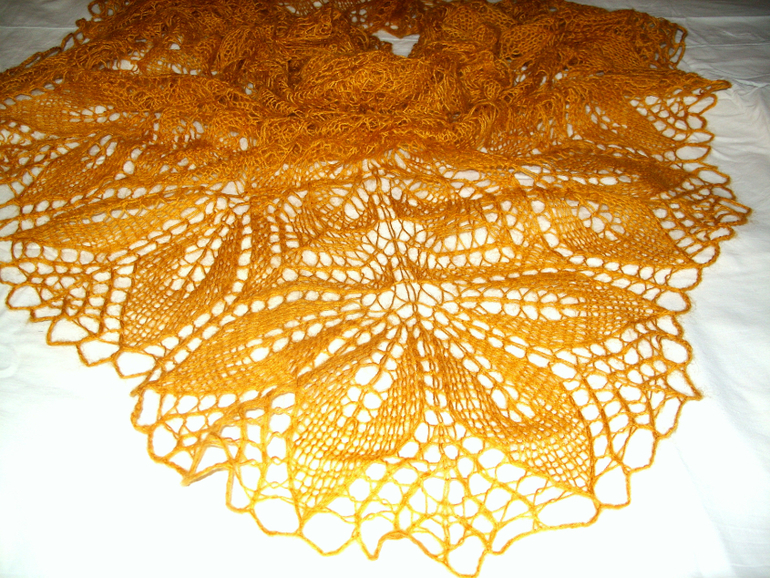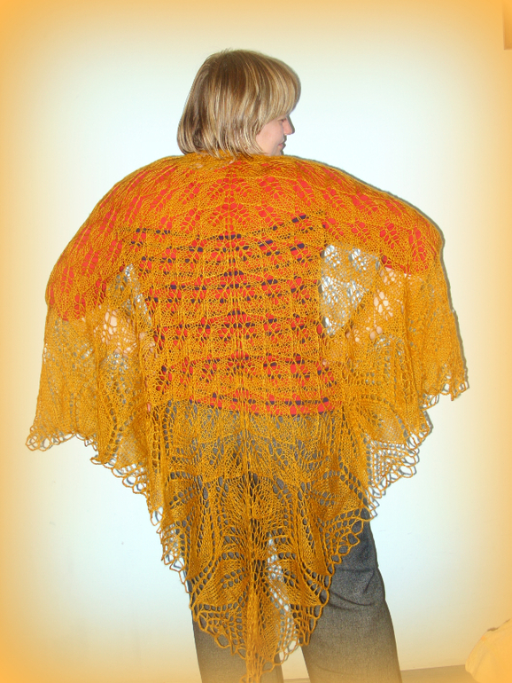 3: "Харуни" моя наверное, самая любимая шаль, я их связала уже 5 штук, эта размером 220х125см. Цвет горчичный, даже не ожидала, что цвет получится таким теплым, она как будто из золота с медным отливом, очень красивая получилась. вес 110г.