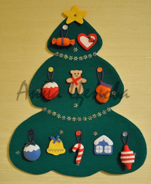 Я с новой елочкой - практически повтор моей первой, только теперь с основой фетр+велкро, так как половина фигурок на липучках (здесь они плоские), а остальные - на пуговицах. Высота 53 см.