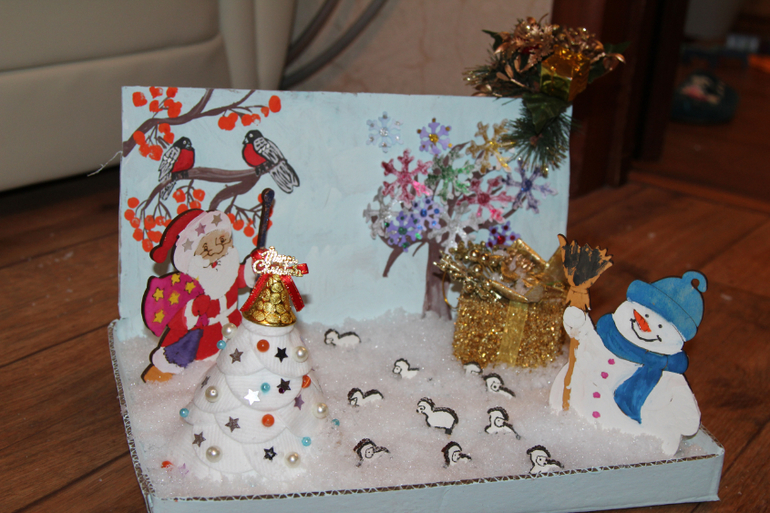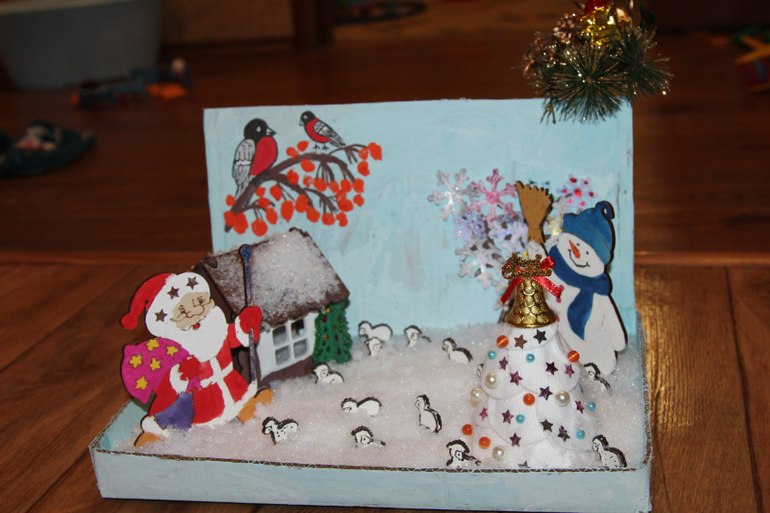 Дети раскрашивали коробку, Мороза и Снеговика, снежинки, потом наклеивали их, так же раскрашивали домик и овечек. И делали пальчиковыми красками рябину.