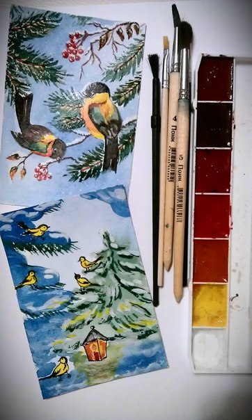 Живопись, точечная росписьРисую чаще маслом, но тут так захотелось акварелью! И что-то новогоднее, как те советские открытки, помните?)
