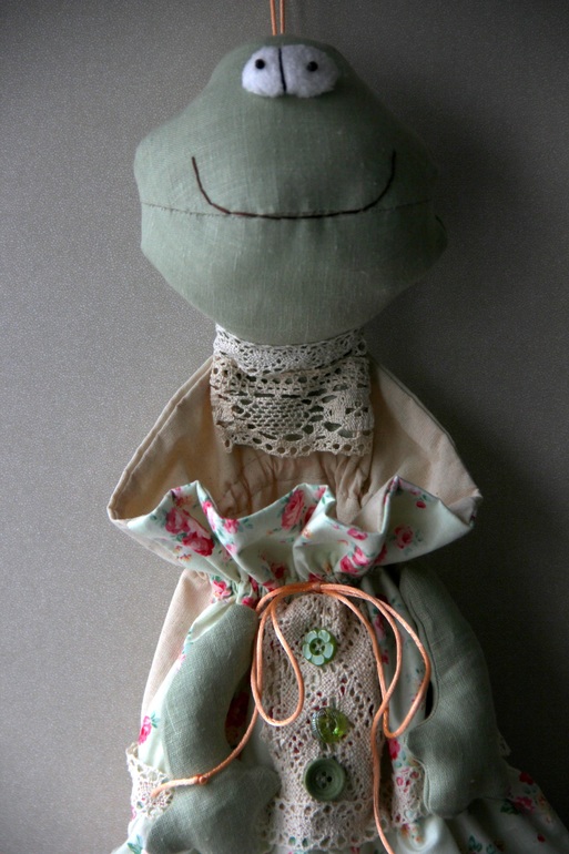 Фото темноватые получились, но я торопилась запечатлеть эту лапчатую мадам для истории. Рост у лягушки приличный, около 70 см по-моему (от головы до ножек). Мешок с подкладом, уплотнен флизелином, затягивается шнурком. Лен, хлопок, хлопковое кружево.
