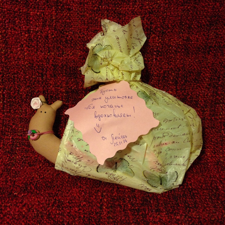 Взаимно))А ваши с дочкой инструменты- принадлежности поместились в органайзеры? Улитку старалась сделать в "твоём" стиле- вкусную и нежную) На шее у неё пончик ручной работы, и вышивка тоже ручная- Инесса делала)) Вот такая вся xэндмэйдная улитка вышла))Пусть она правда тебя вдоxновляет и ты будешь радовать нас своими рукоделками!Спасибо тебе за чудесный обмен