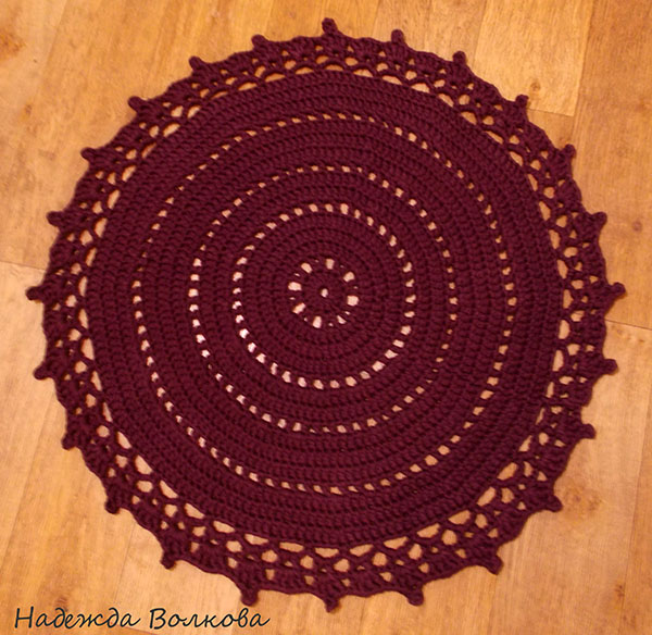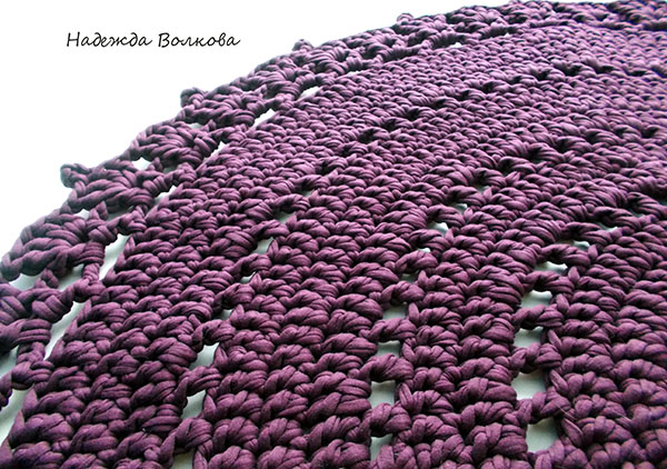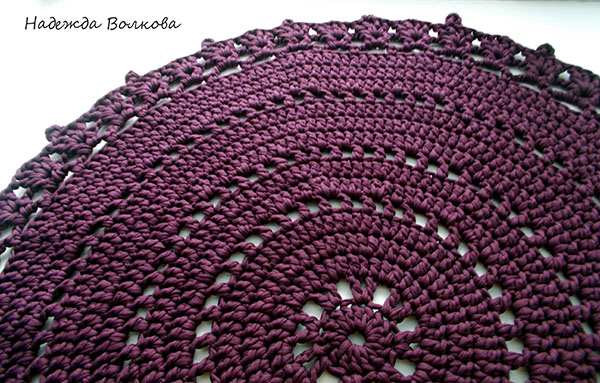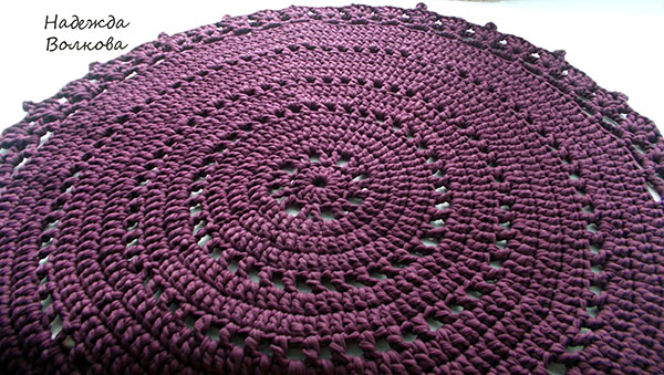Давно я хотела попробовать такую пряжу, и тут моя мамуля попросила коврик им в спальню, ну вот я и испробовала ее в деле). Коврик получился в диаметре 85 см. Пряжа спагетти ушло меньше 2,5 бобин по 120 м, крючок 9.