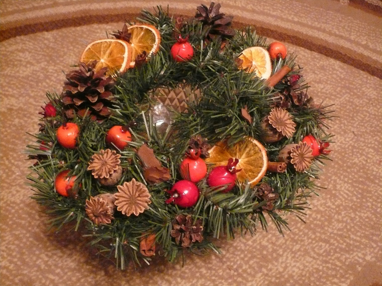 Веночек украсила сушенными апельсинами, шишками, маковыми коробочками и палочками корицы. Для яркости ягодки ... в середине будет свеча стоять красного цвета.
